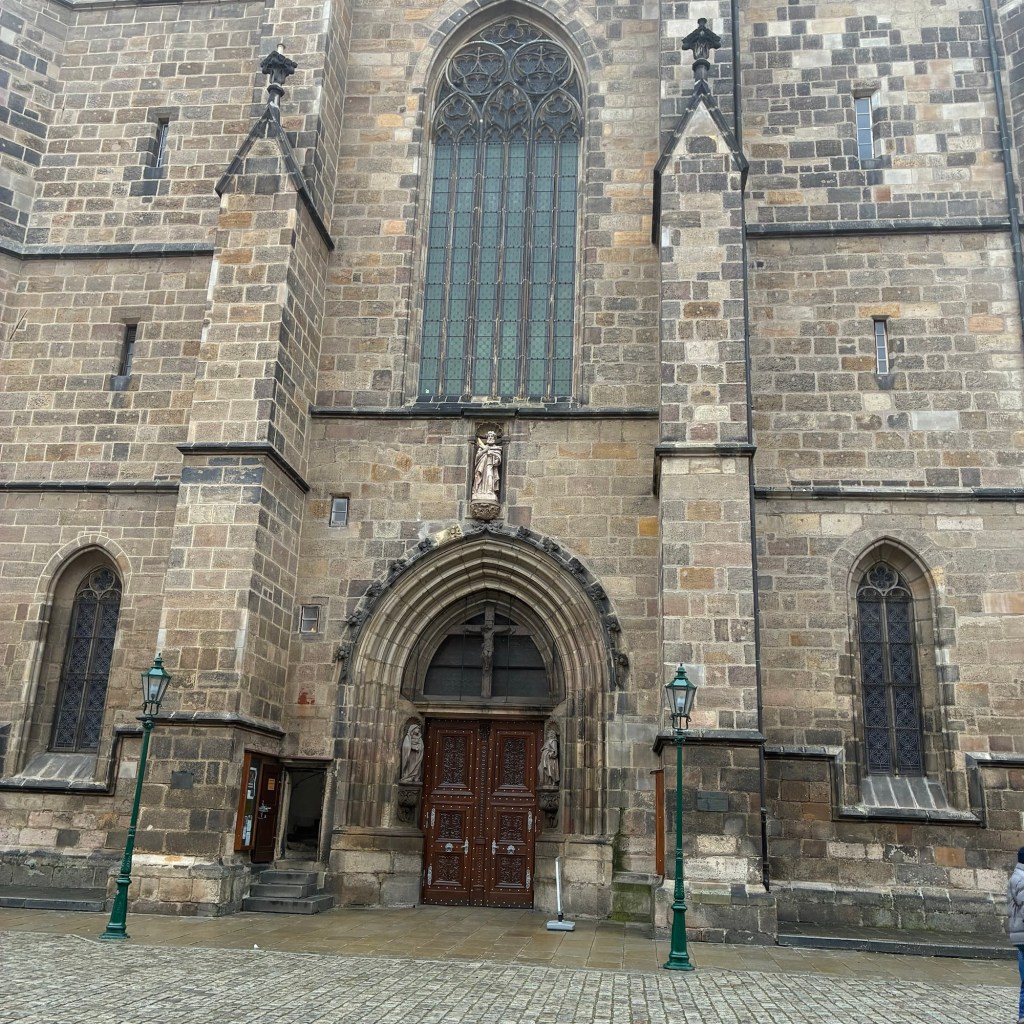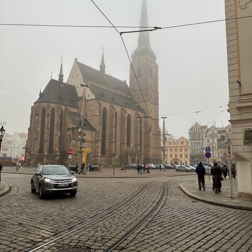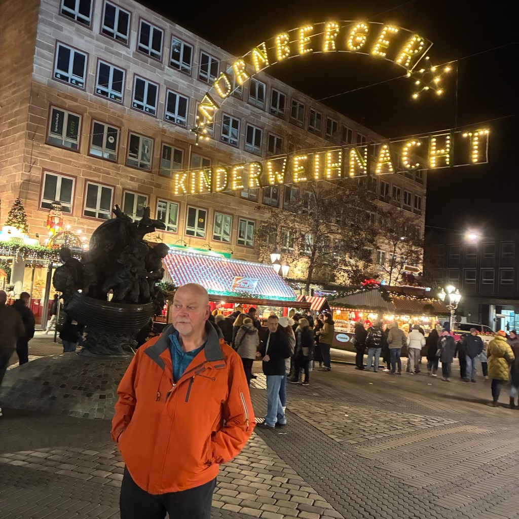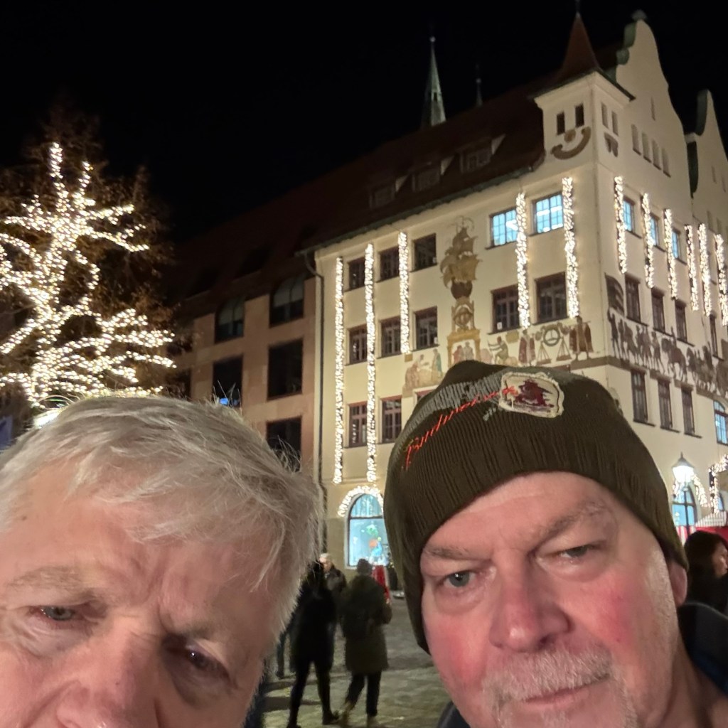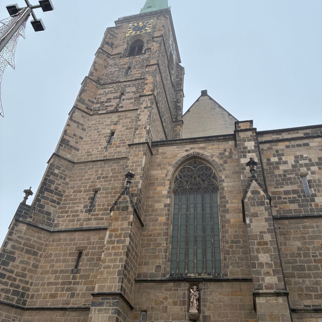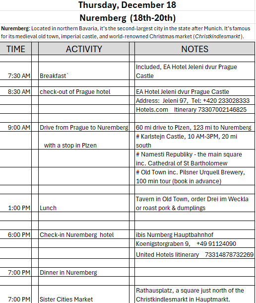 Entry hallway to breakfast.An exceptional breakfast buffet for a hotel chain.Very traditional European breakfast assortment.We enjoy experiencing the local breakfast juices. Here it was Sour Cherry and it was good enough for a second cup.Found a “Lidl” store in Bucharova outside of Prague (Aldi’s competitor).Two kinds of ‘Roger’ candy bar, Classic and Nut. Name/flavor coincidences?Pictures of the town Plzen, Czech Republic. Great architecture and their Christmas Market.PlzenPlzenPlzenPlzenPlzenPlzenCathedral of St. Bartholomew, PlzenGothic cathedral with the tallest church towers in the Czech Republic.PlzenPlzenCathedral of St BartholomewPlzenTallest church tower in in the Czech Republic.PlzenPlzenPlzenFor lunch, assorted sausages with mustard and sauerkraut along with a fresh pretzel.PlzenPlzenPlzenPlzenLive cabbage plants, etc decorating the Christmas Market.PlzenInclement weather on our drive back to Nuremberg.Nuremberg Christmas Market, one of many entrances.Rear view of the infamous Church of Our Lady, a famous landmark.Look closely near the top, you’ll see the Mannleinlaufen Clock. Every day at noon the performance (created in 1509) is Seven prince-electors circle Emperor Charles IV.Restaurant for dinner.For dinner, Cordon Bleu with potato salad and roast pork with dumplings.Apple strudel for dessert.Front entrance of the Church of Our Lady.Look for Roger in this picture.