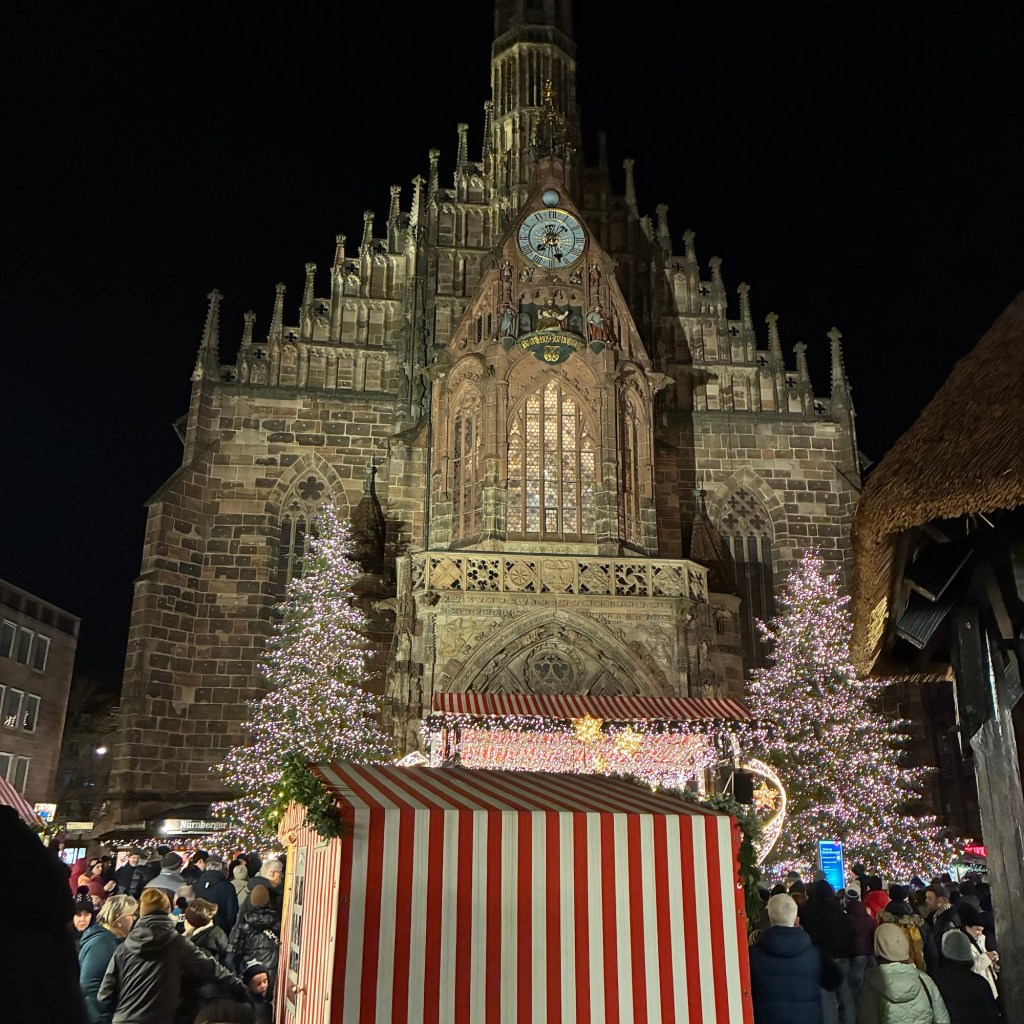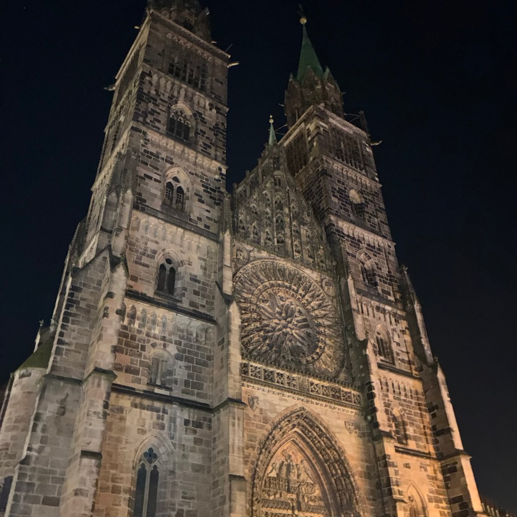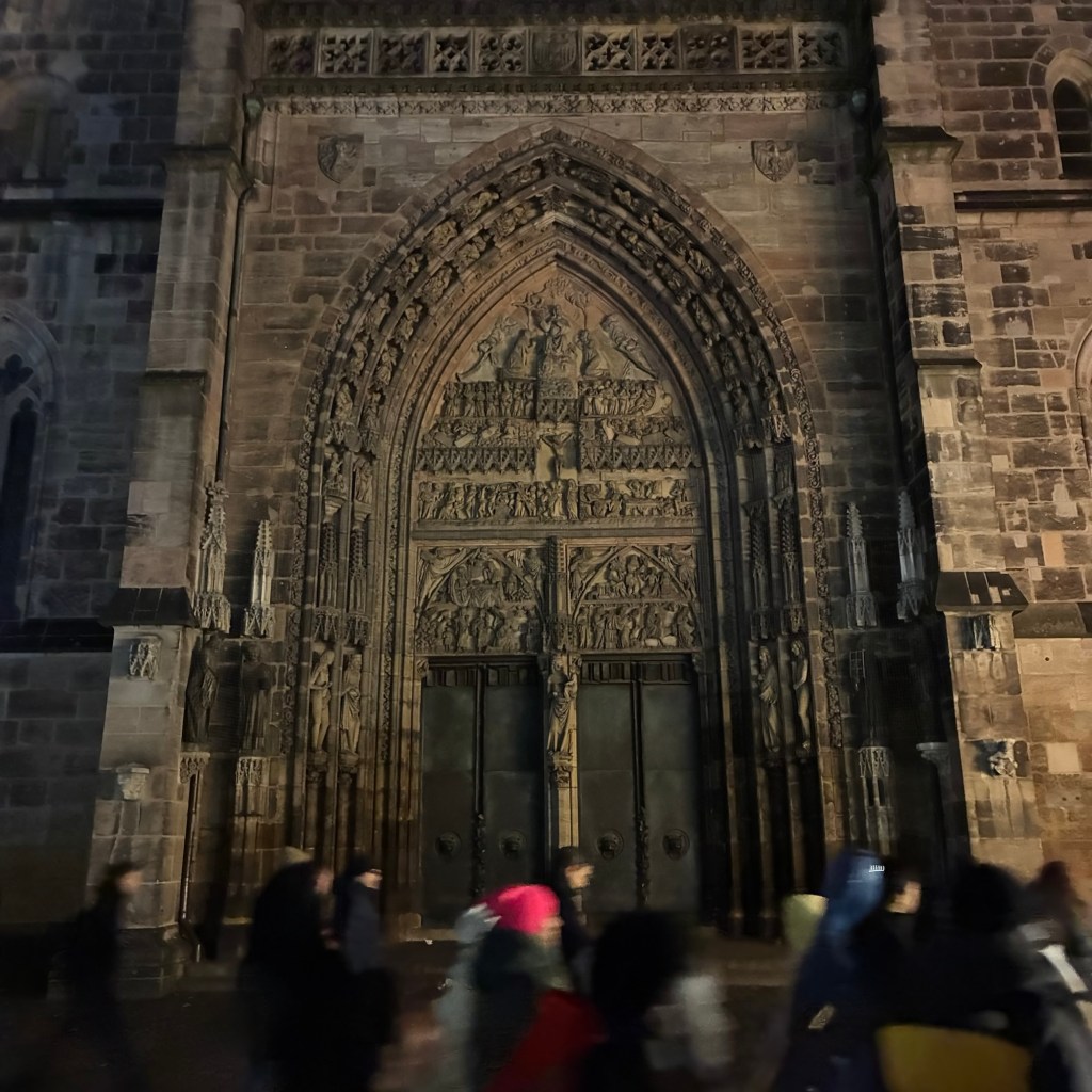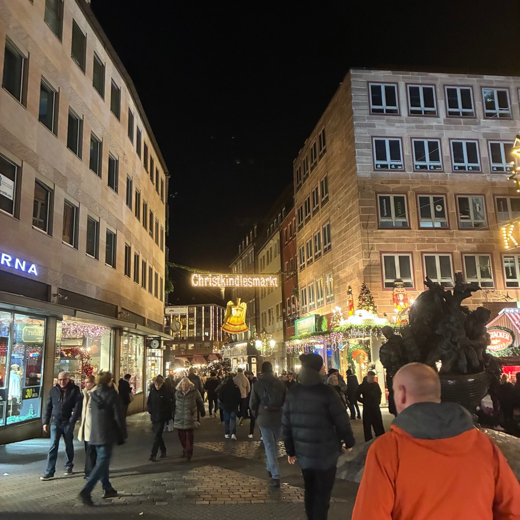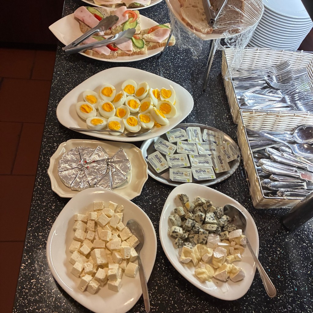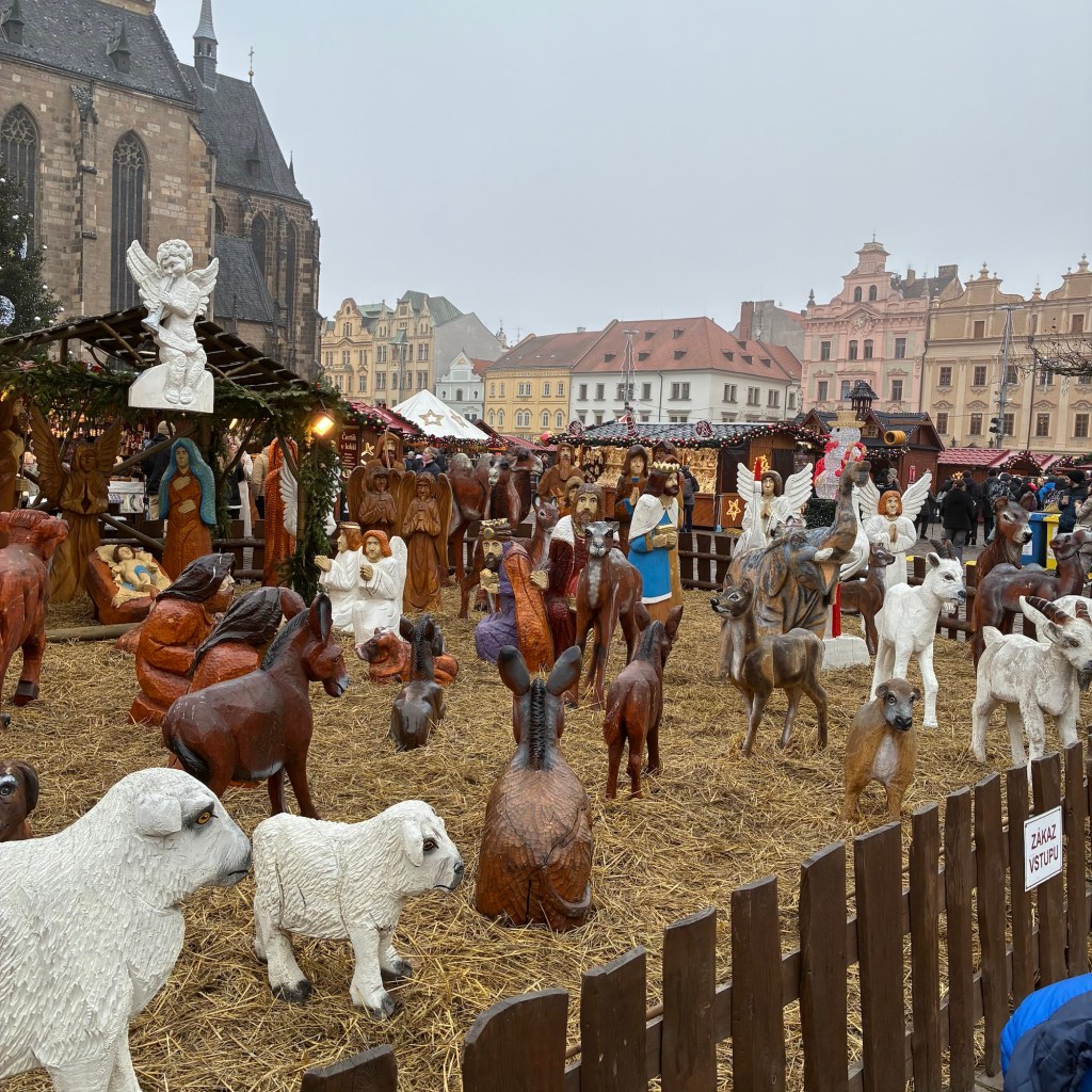 Entry hallway to breakfast.An exceptional breakfast buffet for a hotel chain.Very traditional European breakfast assortment.We enjoy experiencing the local breakfast juices. Here it was Sour Cherry and it was good enough for a second cup.Found a “Lidl” store in Bucharova outside of Prague (Aldi’s competitor).Two kinds of ‘Roger’ candy bar, Classic and Nut. Name/flavor coincidences?Pictures of the town Plzen, Czech Republic. Great architecture and their Christmas Market.PlzenPlzenPlzenPlzenPlzenPlzenCathedral of St. Bartholomew, PlzenGothic cathedral with the tallest church towers in the Czech Republic.PlzenPlzenCathedral of St BartholomewPlzenTallest church tower in in the Czech Republic.PlzenPlzenPlzenFor lunch, assorted sausages with mustard and sauerkraut along with a fresh pretzel.PlzenPlzenPlzenPlzenLive cabbage plants, etc decorating the Christmas Market.PlzenInclement weather on our drive back to Nuremberg.Nuremberg Christmas Market, one of many entrances.Rear view of the infamous Church of Our Lady, a famous landmark.Look closely near the top, you’ll see the Mannleinlaufen Clock. Every day at noon the performance (created in 1509) is Seven prince-electors circle Emperor Charles IV.Restaurant for dinner.For dinner, Cordon Bleu with potato salad and roast pork with dumplings.Apple strudel for dessert.Front entrance of the Church of Our Lady.Look for Roger in this picture.
