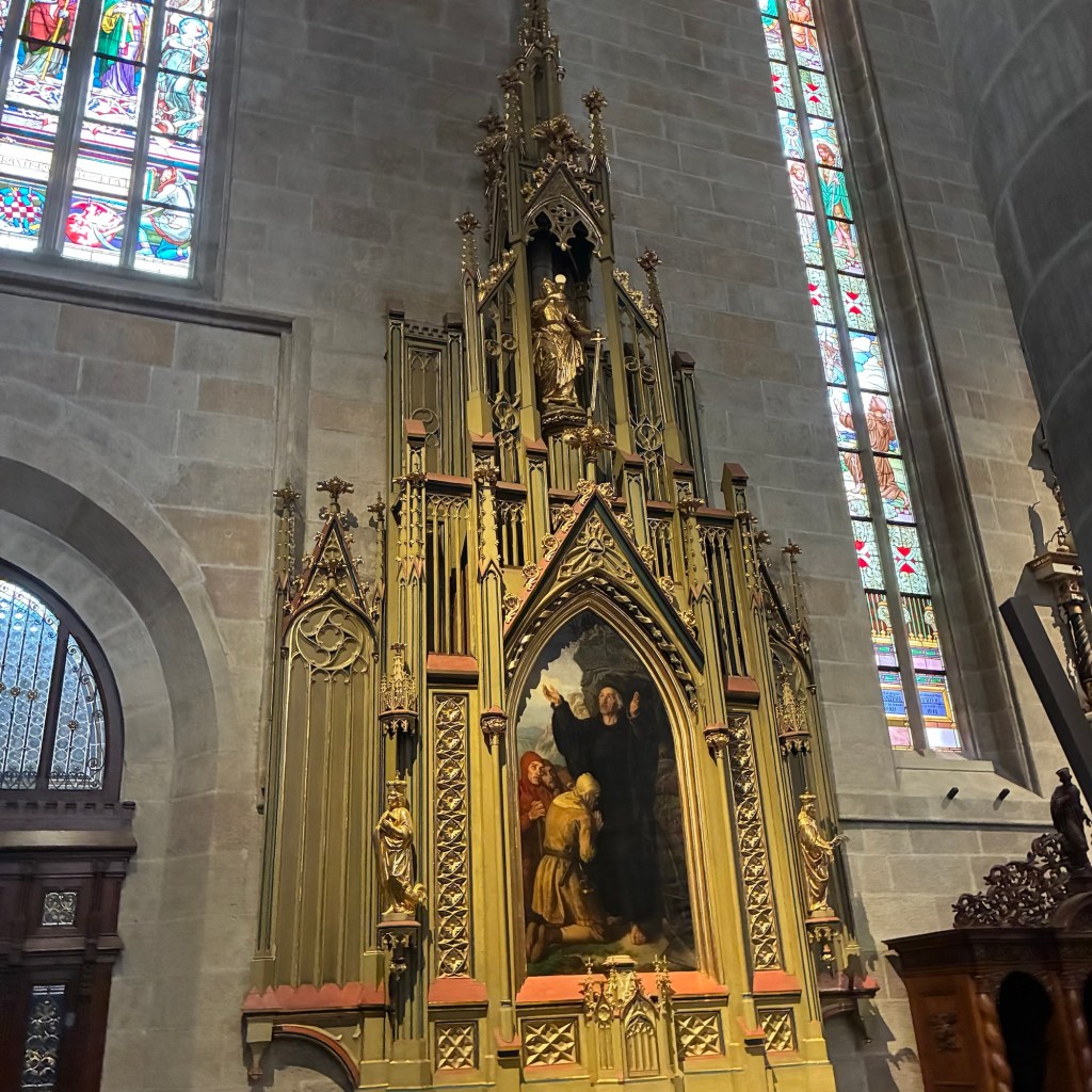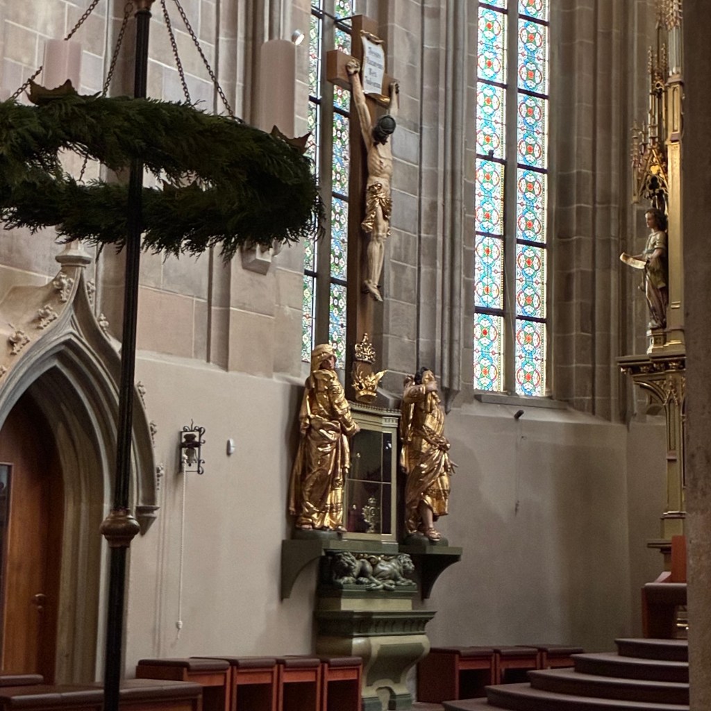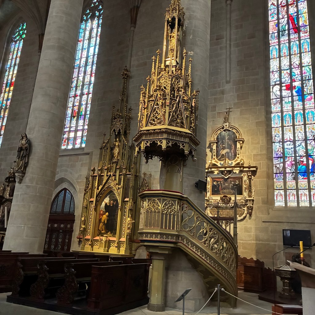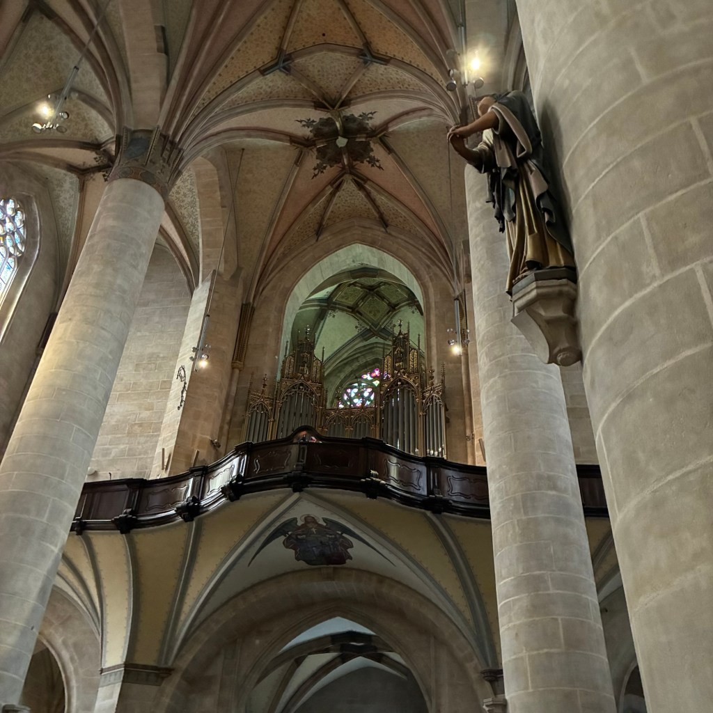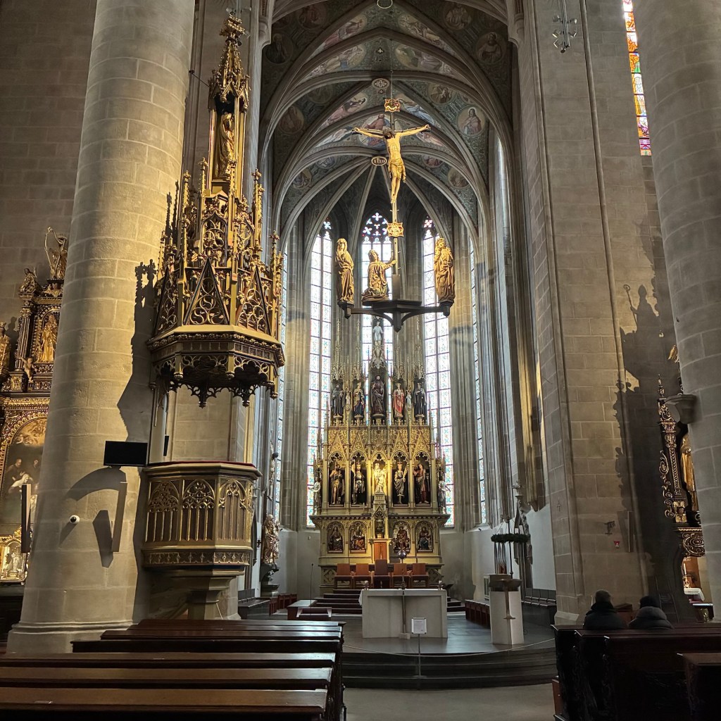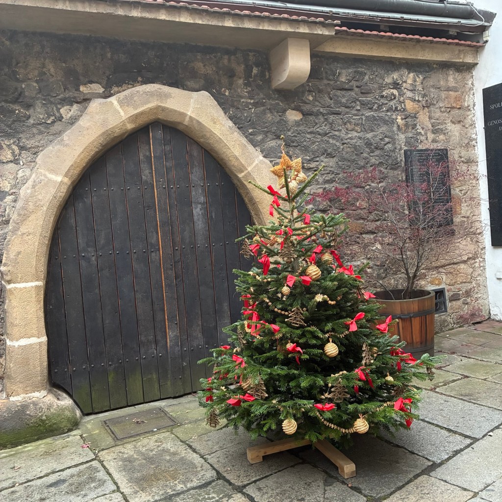 Entry hallway to breakfast.An exceptional breakfast buffet for a hotel chain.Very traditional European breakfast assortment.We enjoy experiencing the local breakfast juices. Here it was Sour Cherry and it was good enough for a second cup.Found a “Lidl” store in Bucharova outside of Prague (Aldi’s competitor).Two kinds of ‘Roger’ candy bar, Classic and Nut. Name/flavor coincidences?Pictures of the town Plzen, Czech Republic. Great architecture and their Christmas Market.PlzenPlzenPlzenPlzenPlzenPlzenCathedral of St. Bartholomew, PlzenGothic cathedral with the tallest church towers in the Czech Republic.PlzenPlzenCathedral of St BartholomewPlzenTallest church tower in in the Czech Republic.PlzenPlzenPlzenFor lunch, assorted sausages with mustard and sauerkraut along with a fresh pretzel.PlzenPlzenPlzenPlzenLive cabbage plants, etc decorating the Christmas Market.PlzenInclement weather on our drive back to Nuremberg.Nuremberg Christmas Market, one of many entrances.Rear view of the infamous Church of Our Lady, a famous landmark.Look closely near the top, you’ll see the Mannleinlaufen Clock. Every day at noon the performance (created in 1509) is Seven prince-electors circle Emperor Charles IV.Restaurant for dinner.For dinner, Cordon Bleu with potato salad and roast pork with dumplings.Apple strudel for dessert.Front entrance of the Church of Our Lady.Look for Roger in this picture.