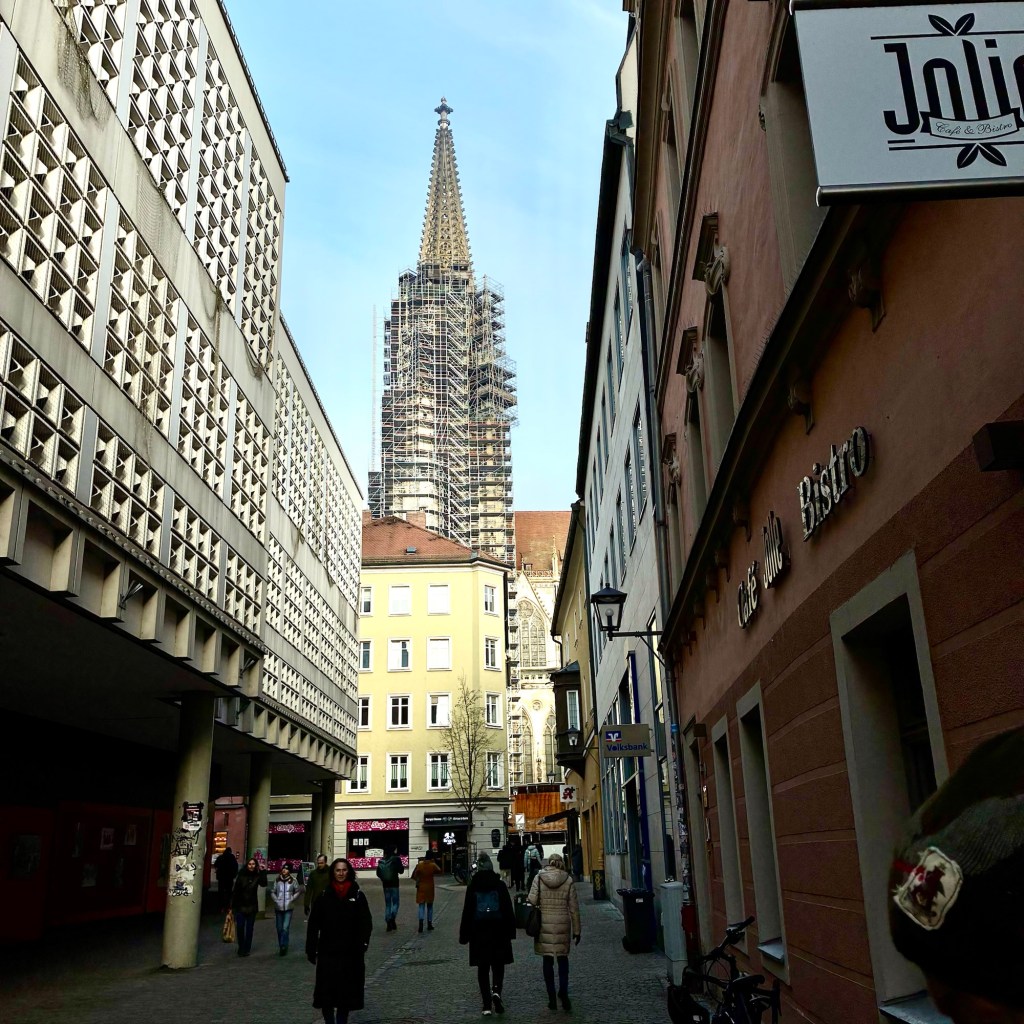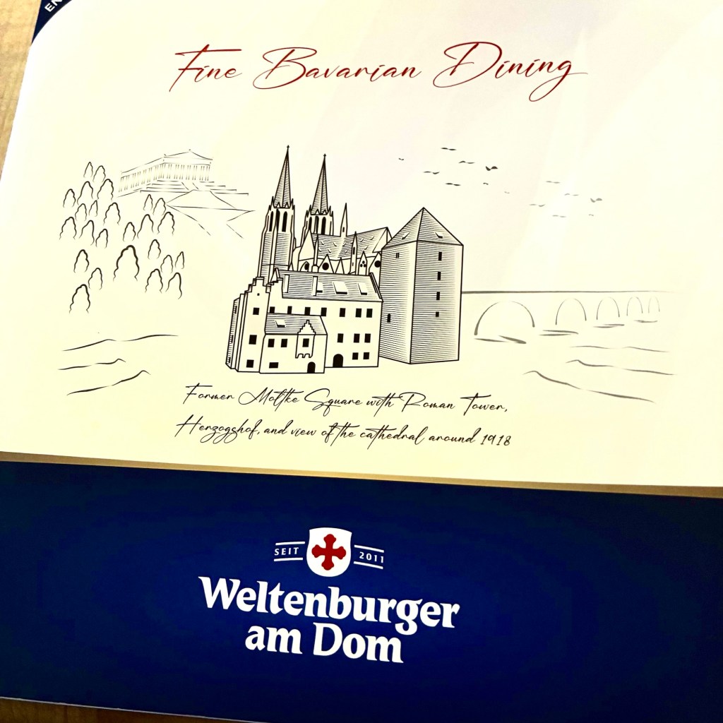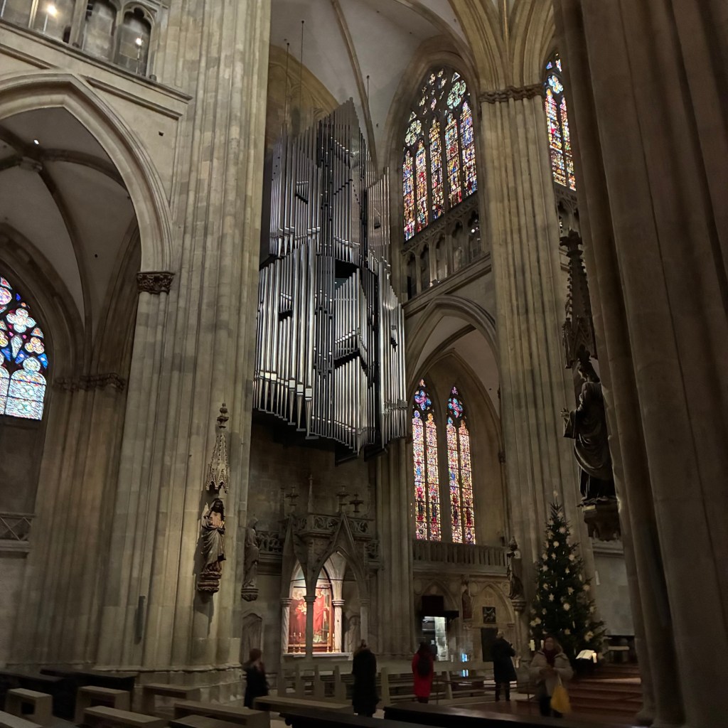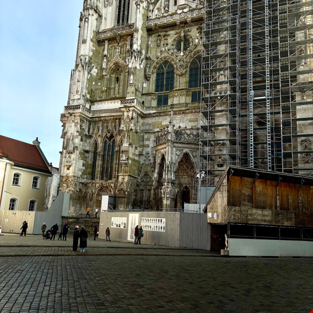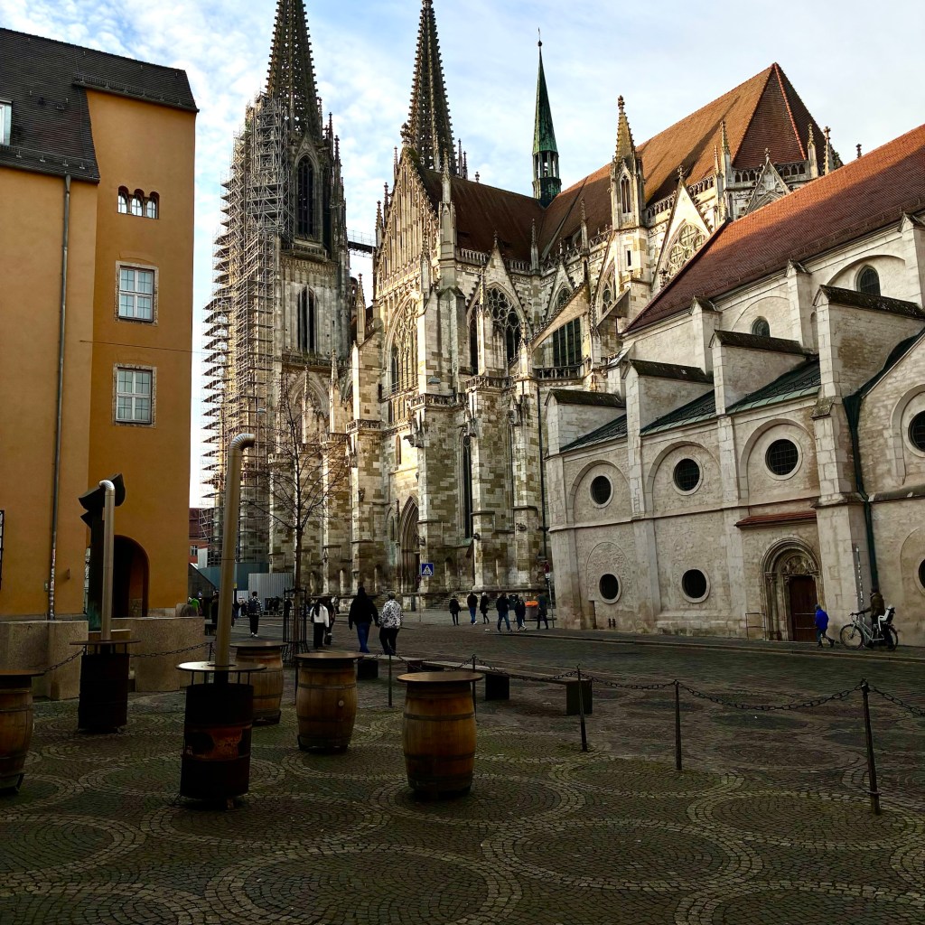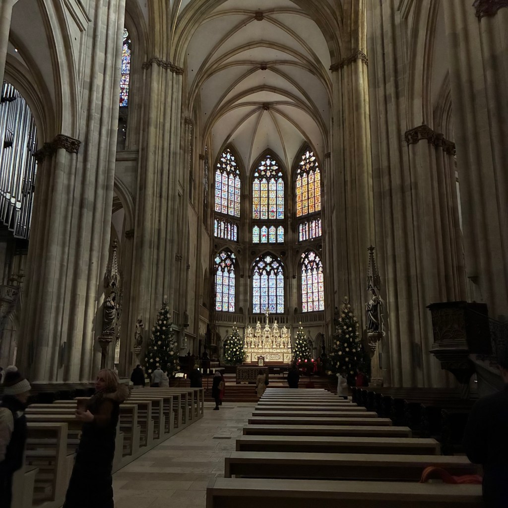 Interior pictures of St Peters Cathedral in Regensburg. Sorry about the poor quality of pictures.Suggest Google for better pictures.Town of Regensburg Germany.Regensburg Christmas MarketExterior work on St Peter’s Cathedral in Regensburg.Interior pictures of the Papal Basilica of St Emmerin.Regensburg View of the cathedral from our hotel.Dinner at our hotel restaurant.Pumpkin Cream Soup. Sweet and sour pumpkin with pumpkin seed oil and pumpkin seeds – Yumm! Ron ate two bowls!Baked Salmon Trout Fillet. Sauerkraut crust, potatoe and apple salad, horseradish dip.Exterior entrance to our hotel.Our hotel room- Hotel Regensburg Herzogshof am Dom.Exterior picture of our hotel.Late night dinner – ciao Pizzeria and Restaurant.Local version of bruschetta ( no balsamic glaze).Rigatoni Rustica.Exterior view of our hotel in Regensberg.