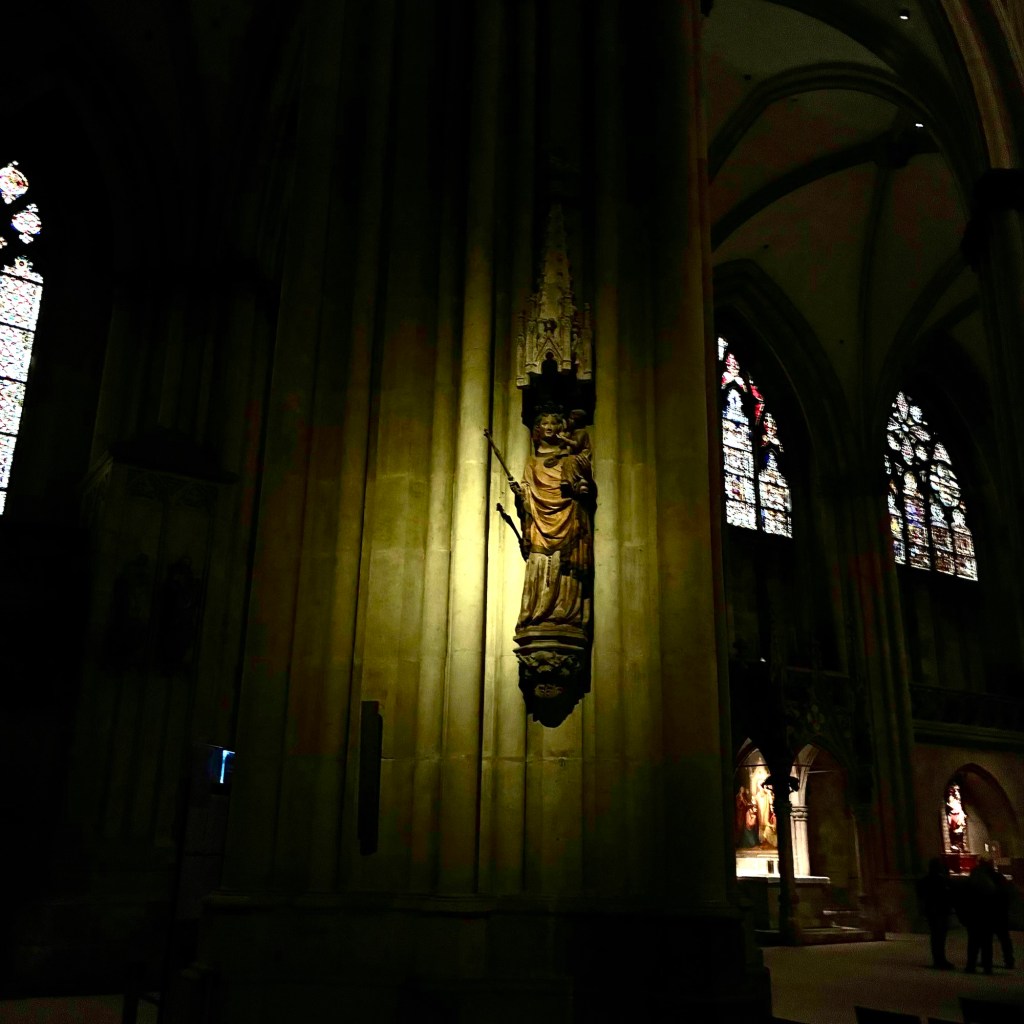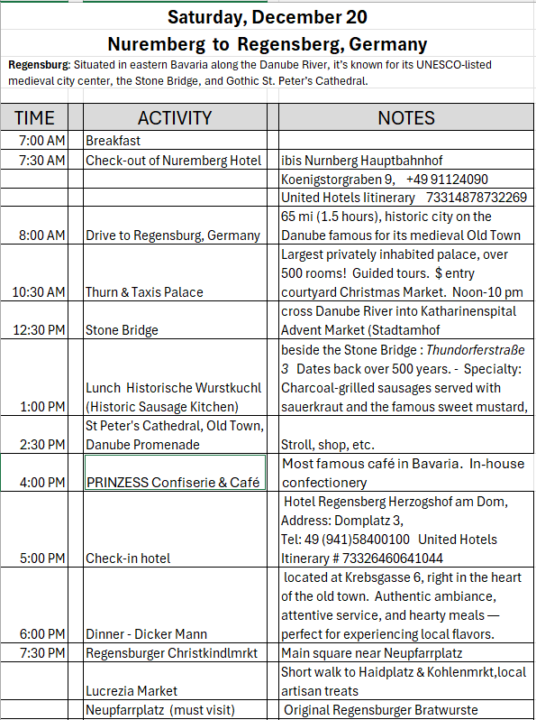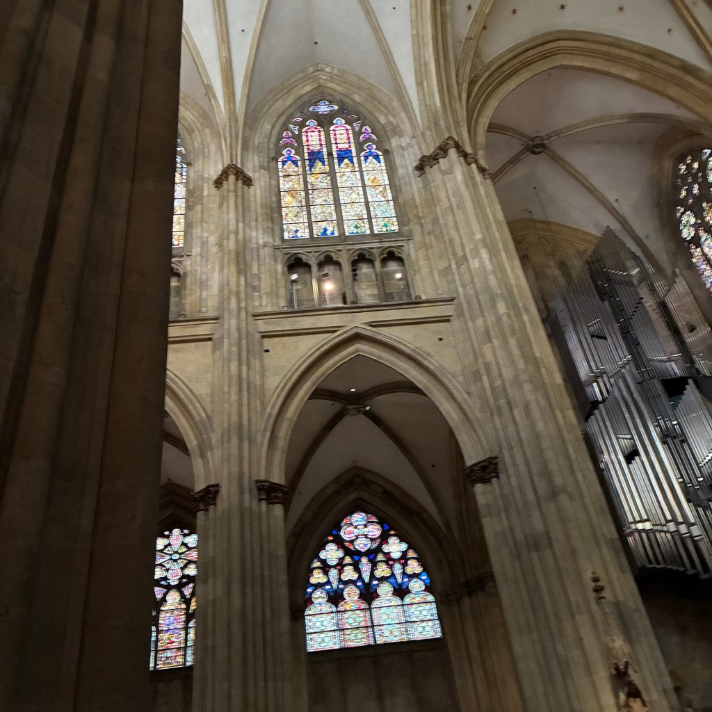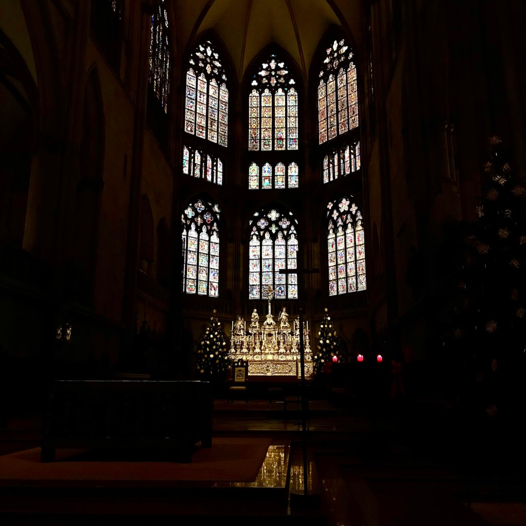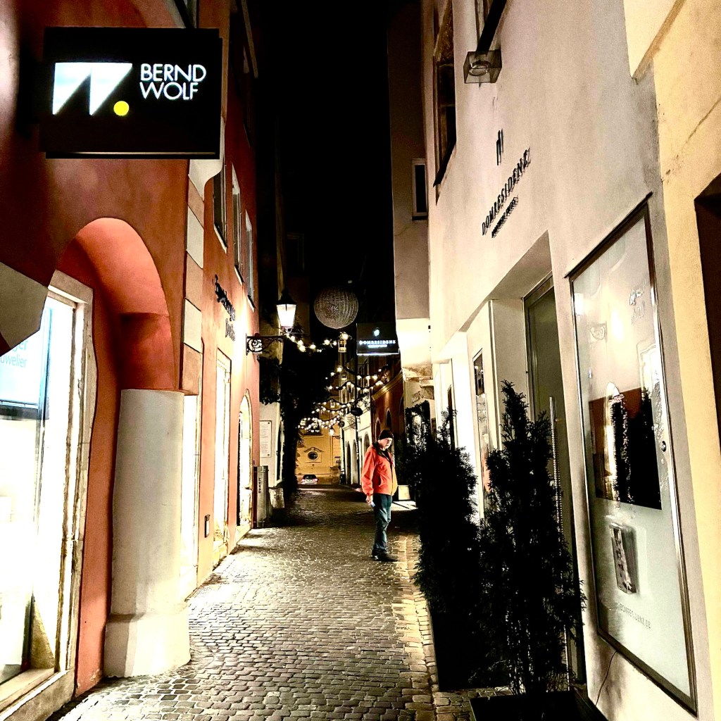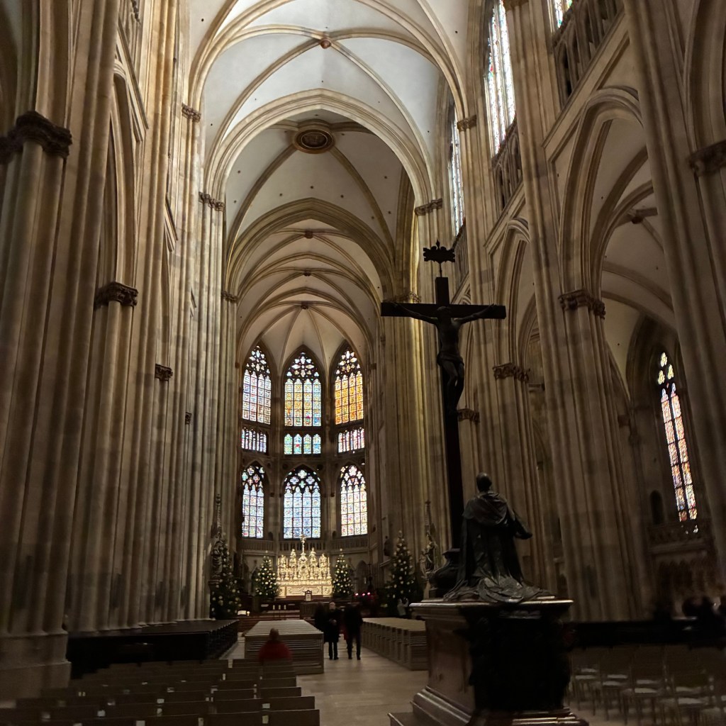 Interior pictures of St Peters Cathedral in Regensburg. Sorry about the poor quality of pictures.Suggest Google for better pictures.Town of Regensburg Germany.Regensburg Christmas MarketExterior work on St Peter’s Cathedral in Regensburg.Interior pictures of the Papal Basilica of St Emmerin.Regensburg View of the cathedral from our hotel.Dinner at our hotel restaurant.Pumpkin Cream Soup. Sweet and sour pumpkin with pumpkin seed oil and pumpkin seeds – Yumm! Ron ate two bowls!Baked Salmon Trout Fillet. Sauerkraut crust, potatoe and apple salad, horseradish dip.Exterior entrance to our hotel.Our hotel room- Hotel Regensburg Herzogshof am Dom.Exterior picture of our hotel.Late night dinner – ciao Pizzeria and Restaurant.Local version of bruschetta ( no balsamic glaze).Rigatoni Rustica.Exterior view of our hotel in Regensberg.