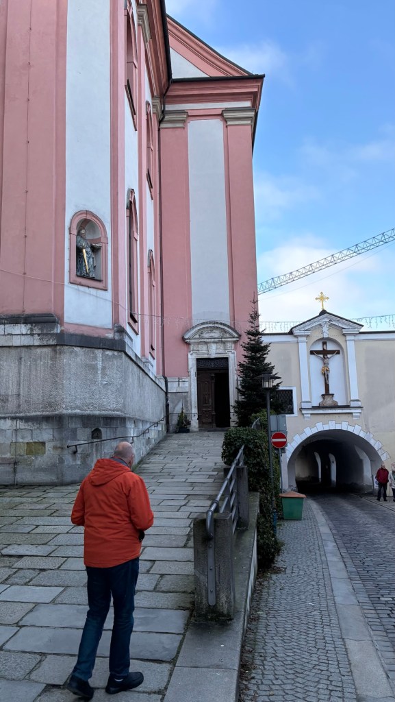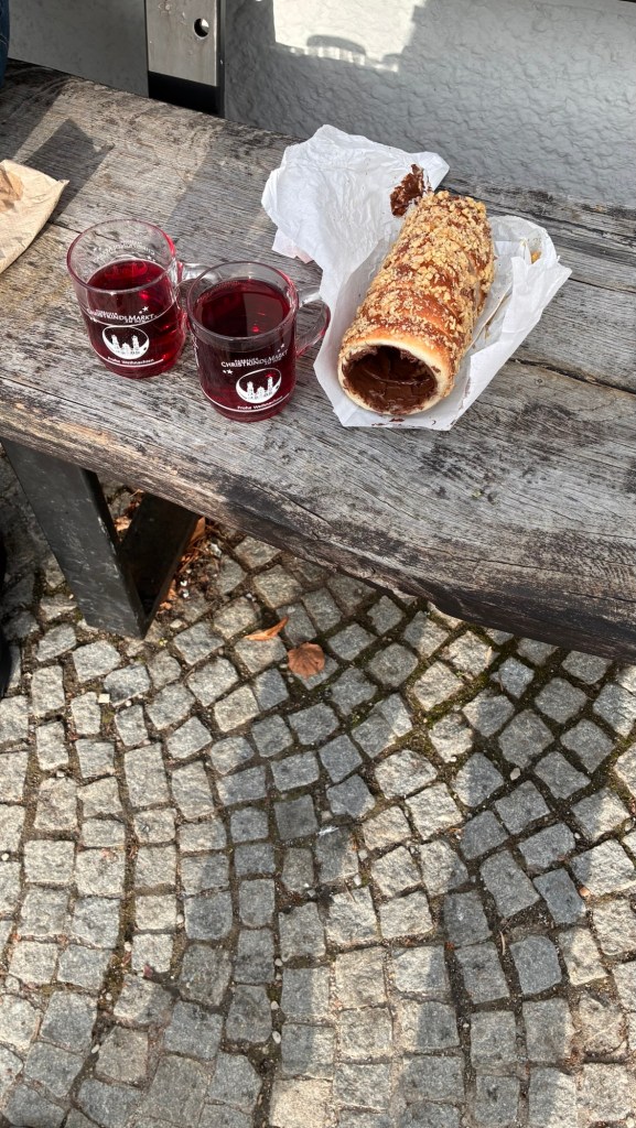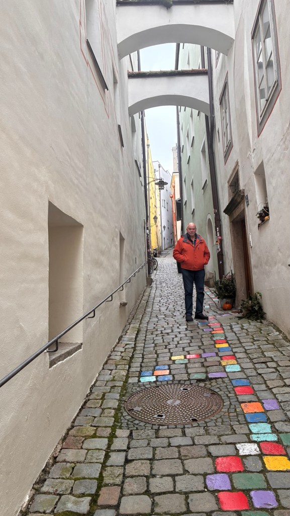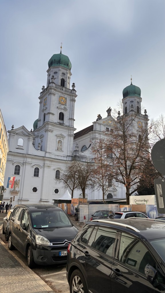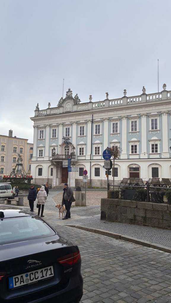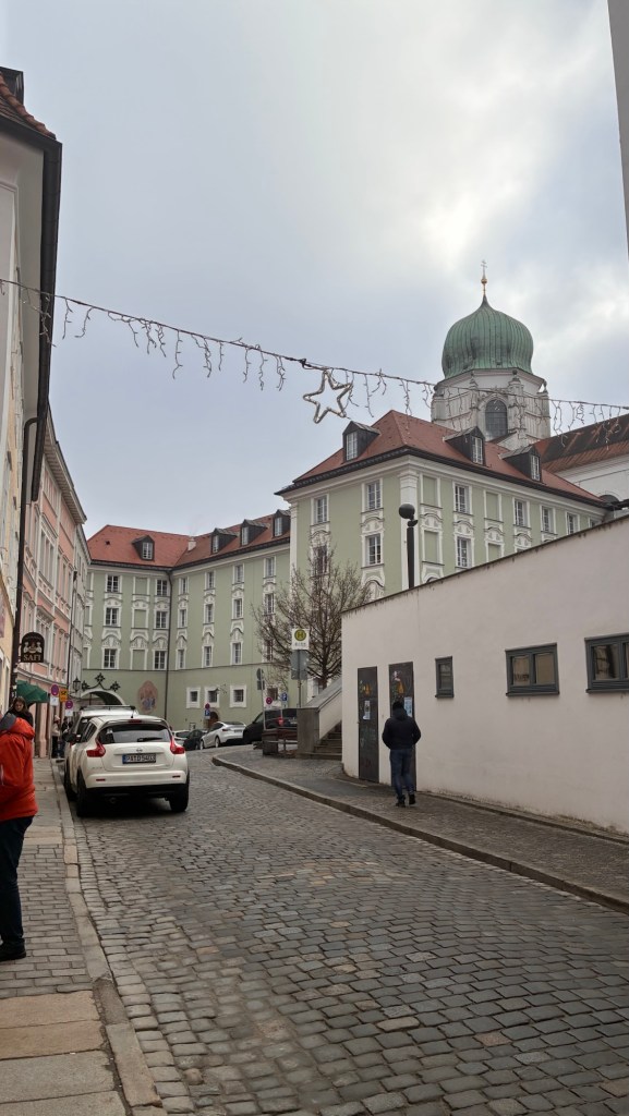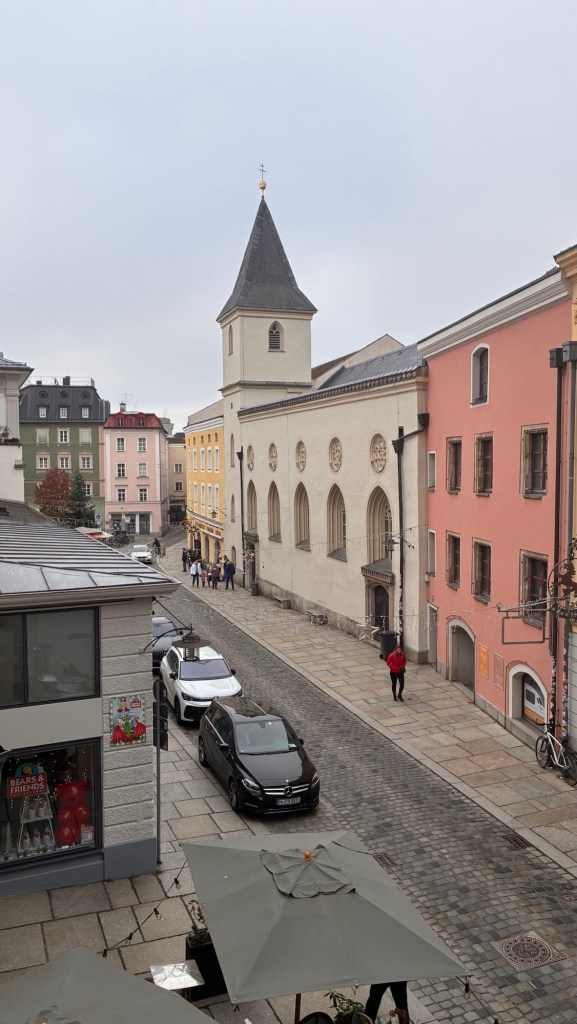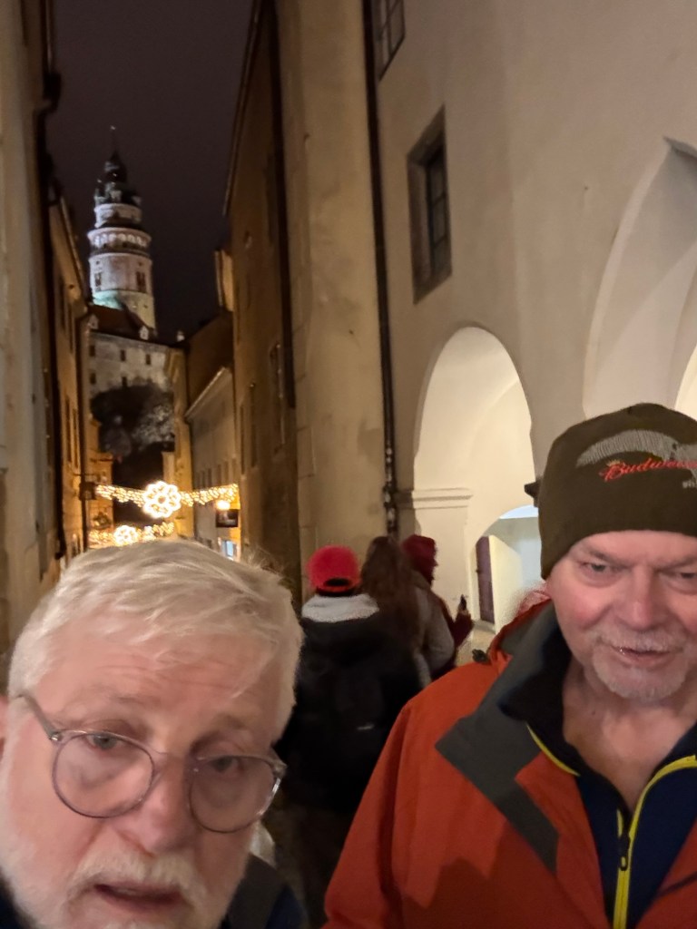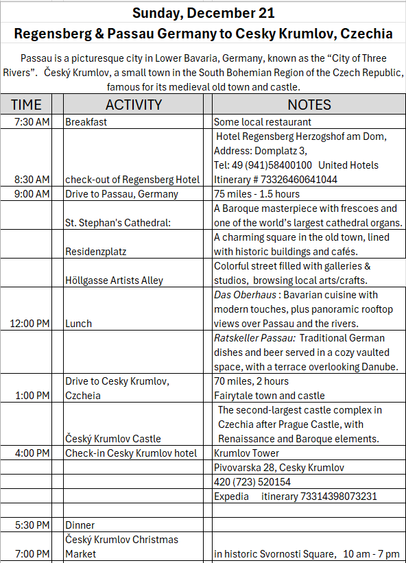 Way to start a breakfast. A selection of juices plus Mimosas!Our hotel located directly across the street of St Stephan’s Cathedral.No hotel parking – it’s three blocks away and all cobblestones.Regensberg church.St Paul’s church – Regensberg.Streets and alleys of Passau, Germany.Left section of the exterior of St Stephan’s CathedralA Baroque masterpiece with a large number of frescoes.Passat Christmas Market.A MalibuPunch and a chimney cake – inside is lined with Nutella and then rolled in walnuts! YUMMY!Some pictures of the interior of St Stephan Cathedral.Massive updating throughout the church.Sidewalk cafe in Passau. It’s almost zero so no one is there.Side entrance to St Paul’s church which is older than the cathedral.One of the world’s largest organs.Our gloomy drive from Passau Germany to the town of Cesky Krumlov, Czech Republic. Not on the autobahn so it took us hours to get here.Our residence for the night, Krumlov Tower. We’re on the ground level, only three rooms in this tower.Cesky Krumlov Christmas Markets.Hamburger and fries for dinner.Brown pigeon in Passau Germany