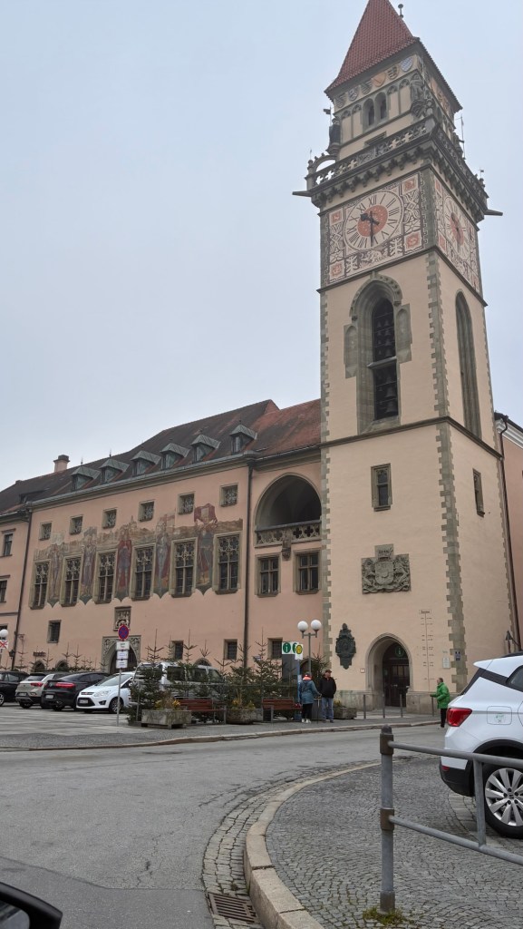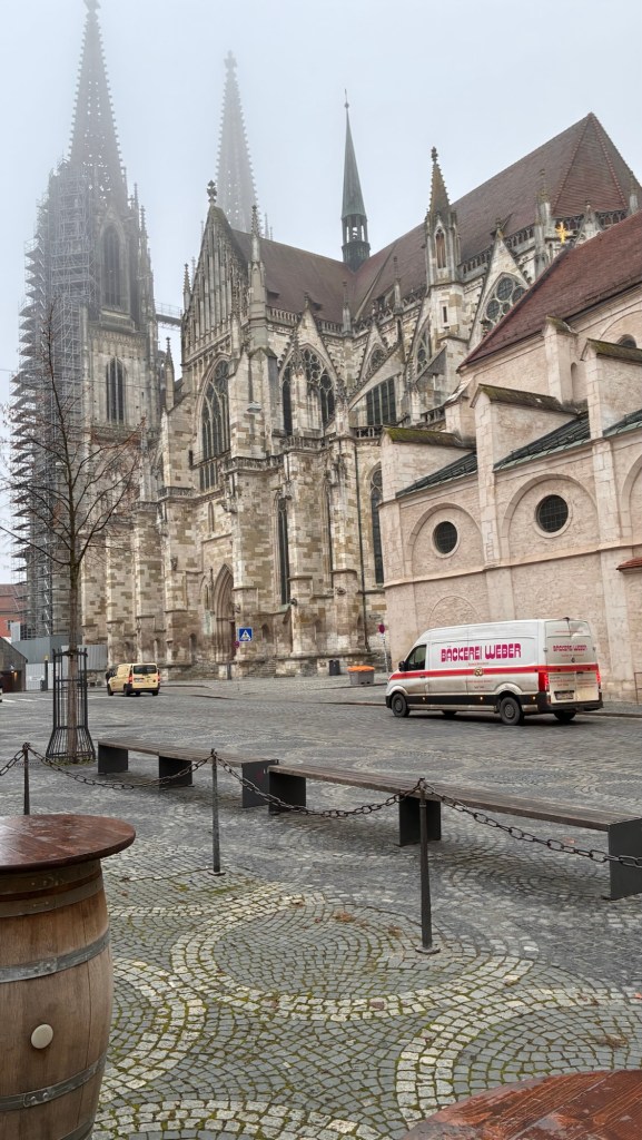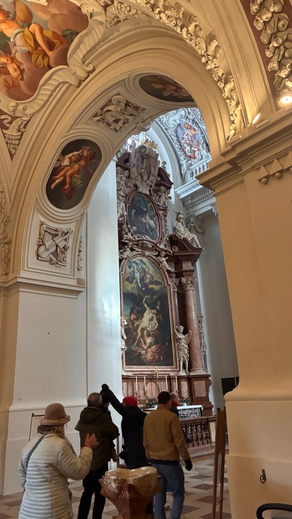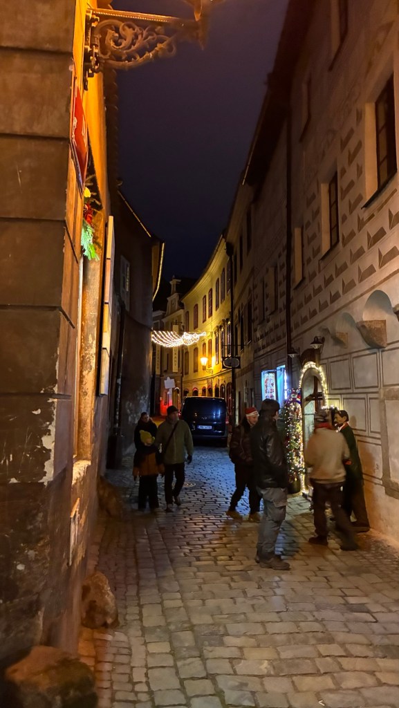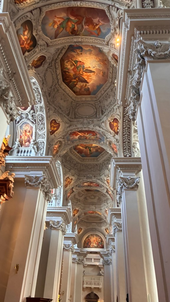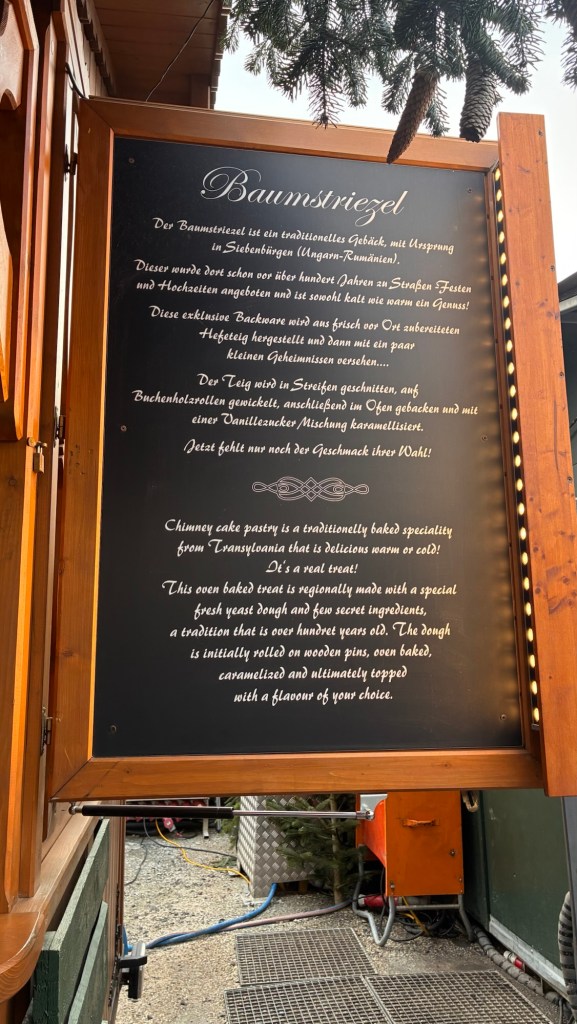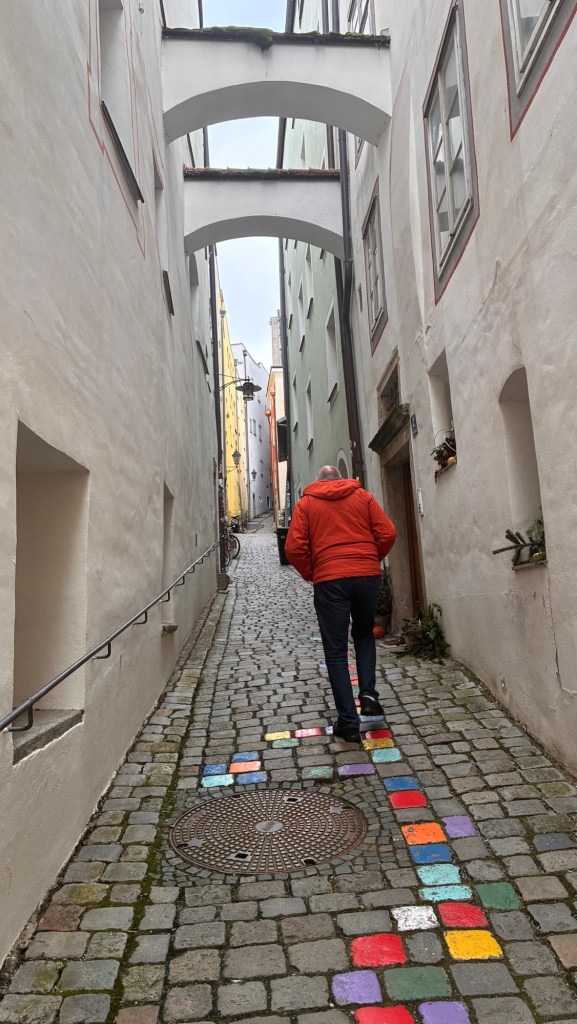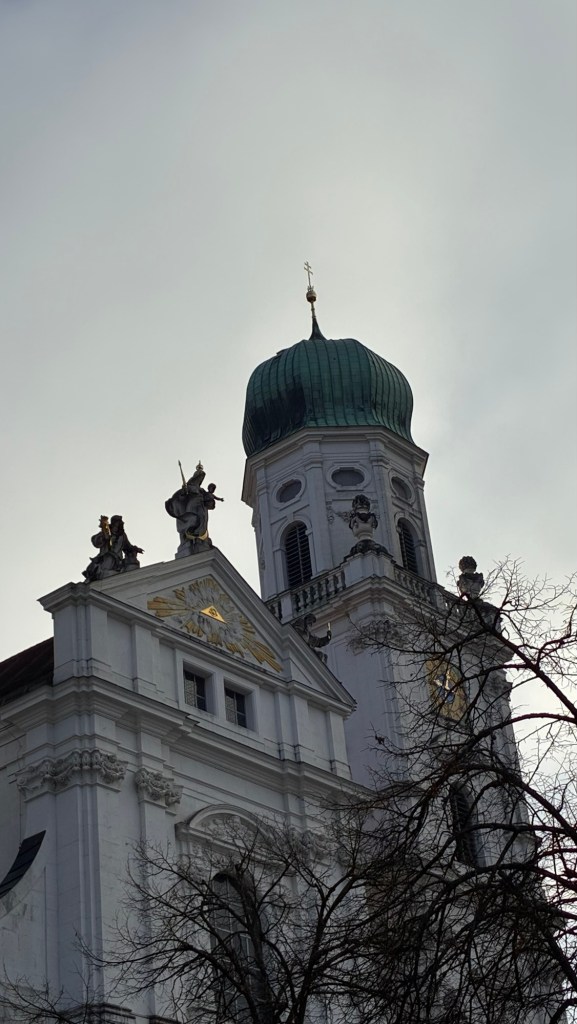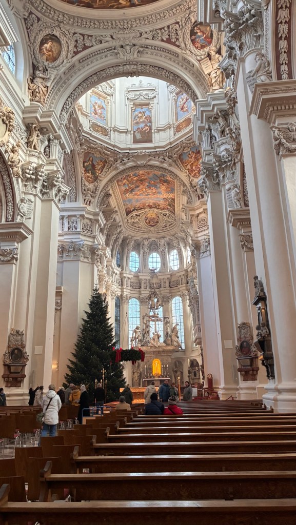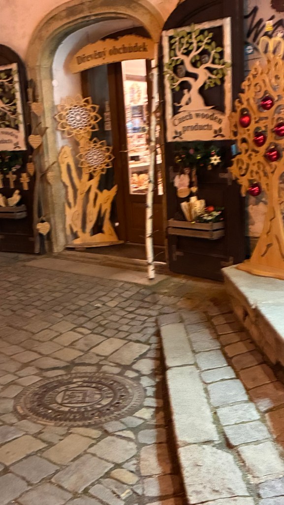 Way to start a breakfast. A selection of juices plus Mimosas!Our hotel located directly across the street of St Stephan’s Cathedral.No hotel parking – it’s three blocks away and all cobblestones.Regensberg church.St Paul’s church – Regensberg.Streets and alleys of Passau, Germany.Left section of the exterior of St Stephan’s CathedralA Baroque masterpiece with a large number of frescoes.Passat Christmas Market.A MalibuPunch and a chimney cake – inside is lined with Nutella and then rolled in walnuts! YUMMY!Some pictures of the interior of St Stephan Cathedral.Massive updating throughout the church.Sidewalk cafe in Passau. It’s almost zero so no one is there.Side entrance to St Paul’s church which is older than the cathedral.One of the world’s largest organs.Our gloomy drive from Passau Germany to the town of Cesky Krumlov, Czech Republic. Not on the autobahn so it took us hours to get here.Our residence for the night, Krumlov Tower. We’re on the ground level, only three rooms in this tower.Cesky Krumlov Christmas Markets.Hamburger and fries for dinner.Brown pigeon in Passau Germany