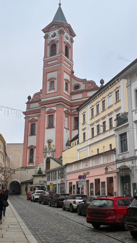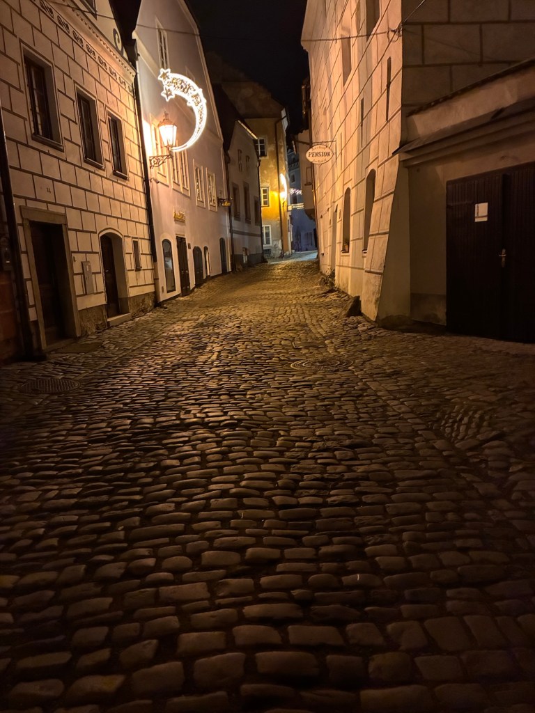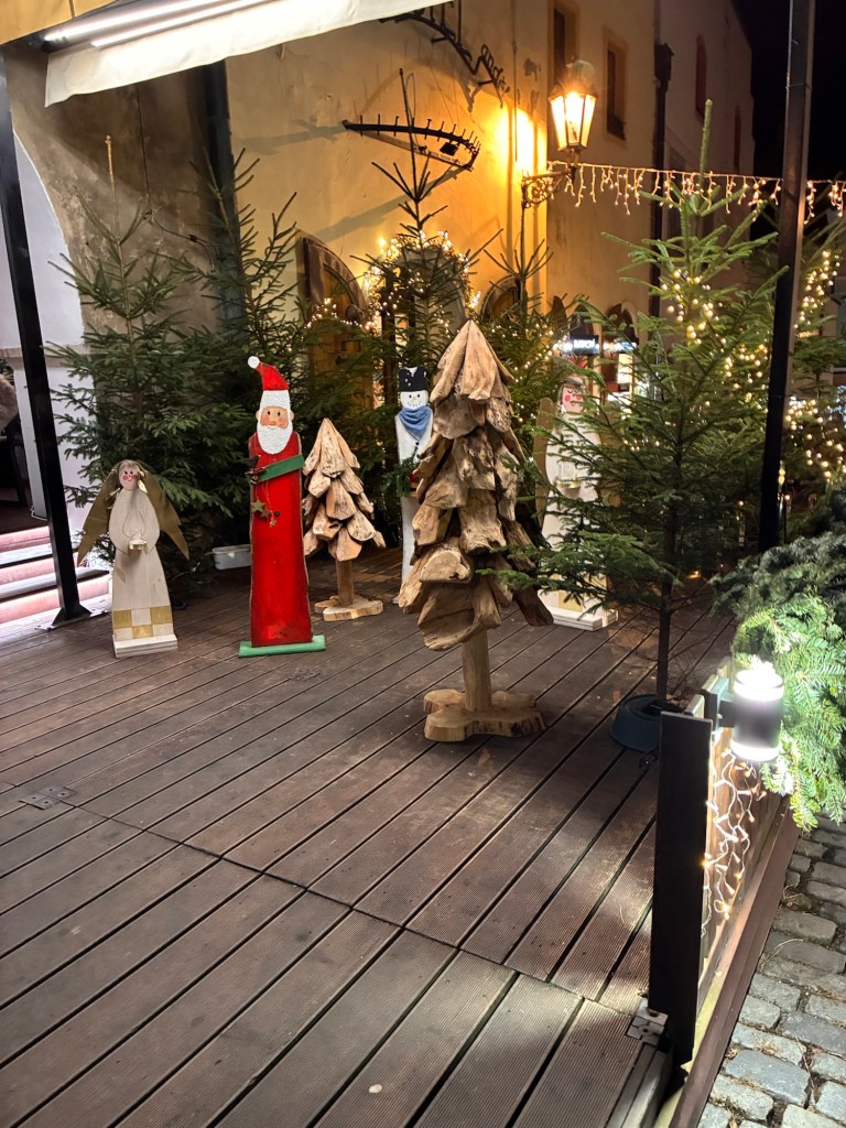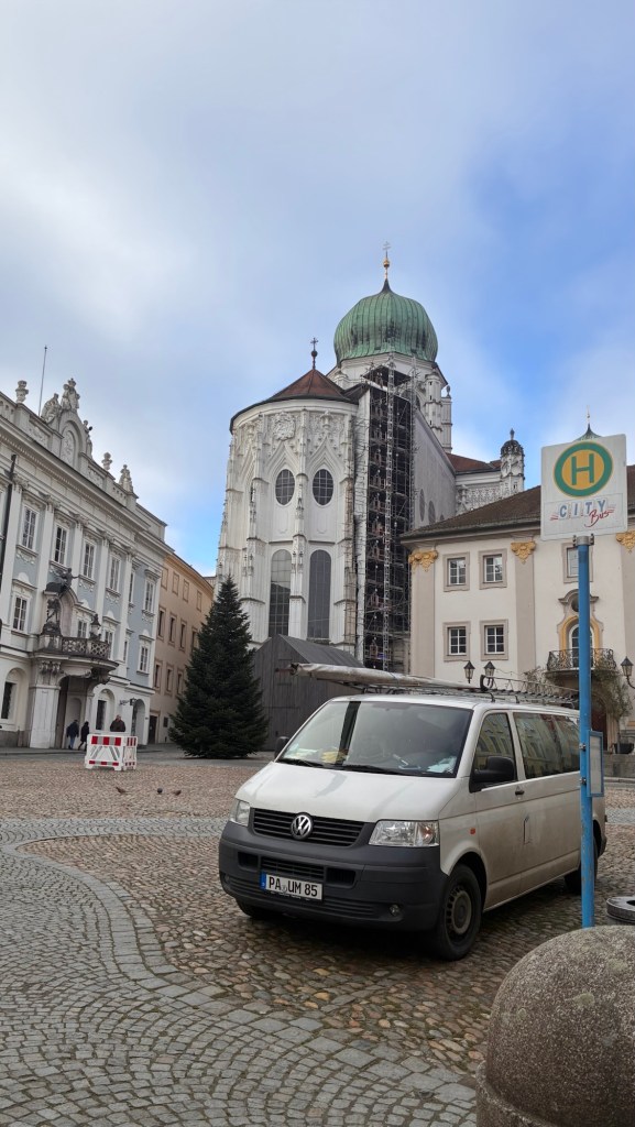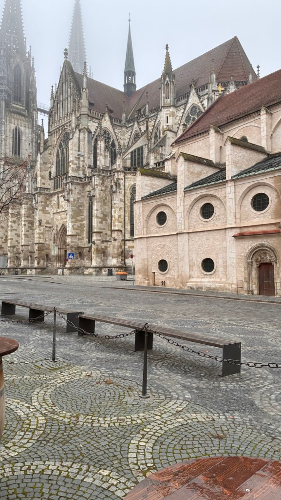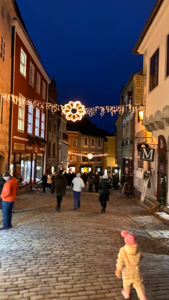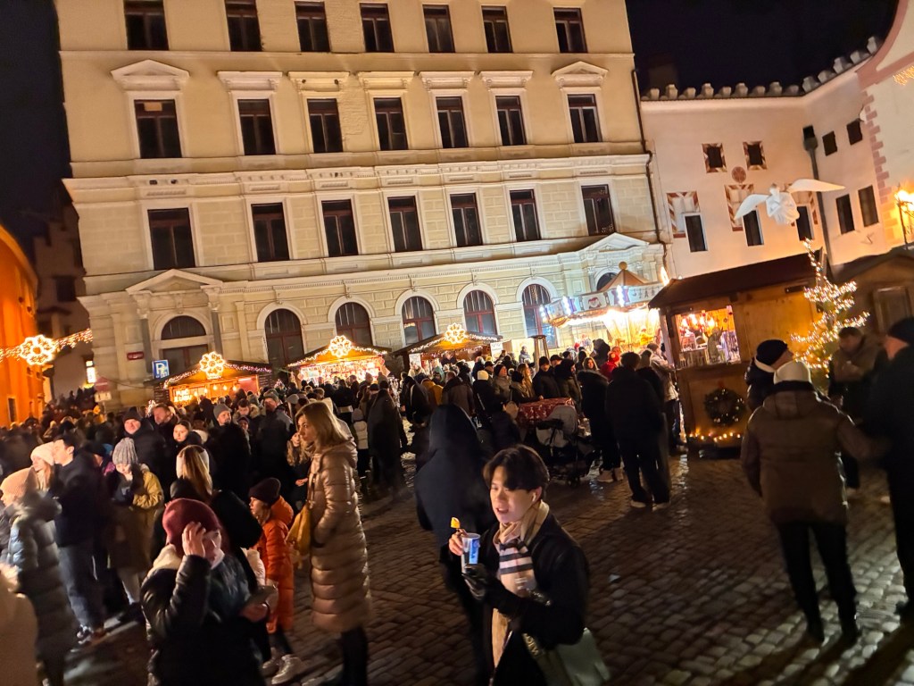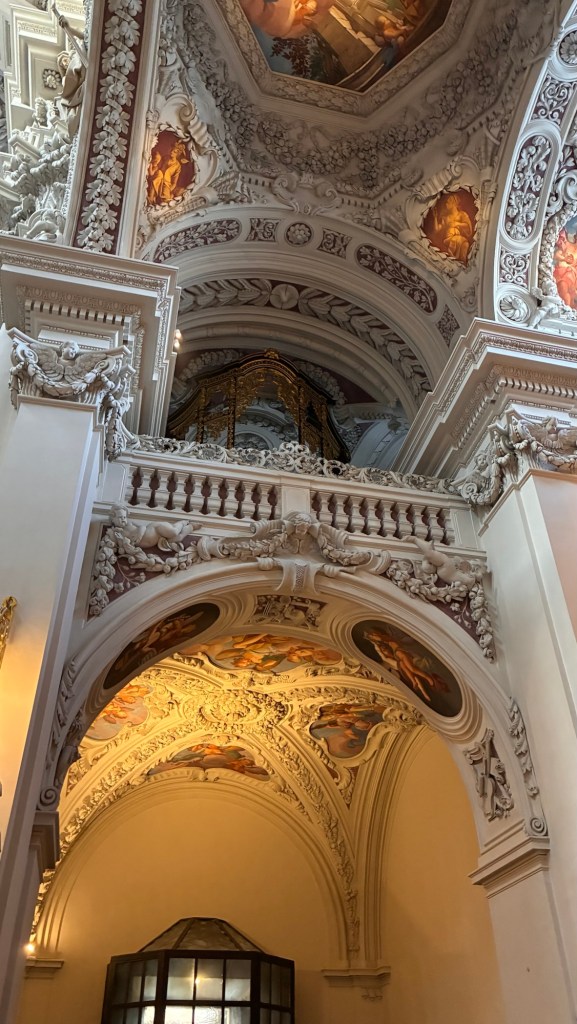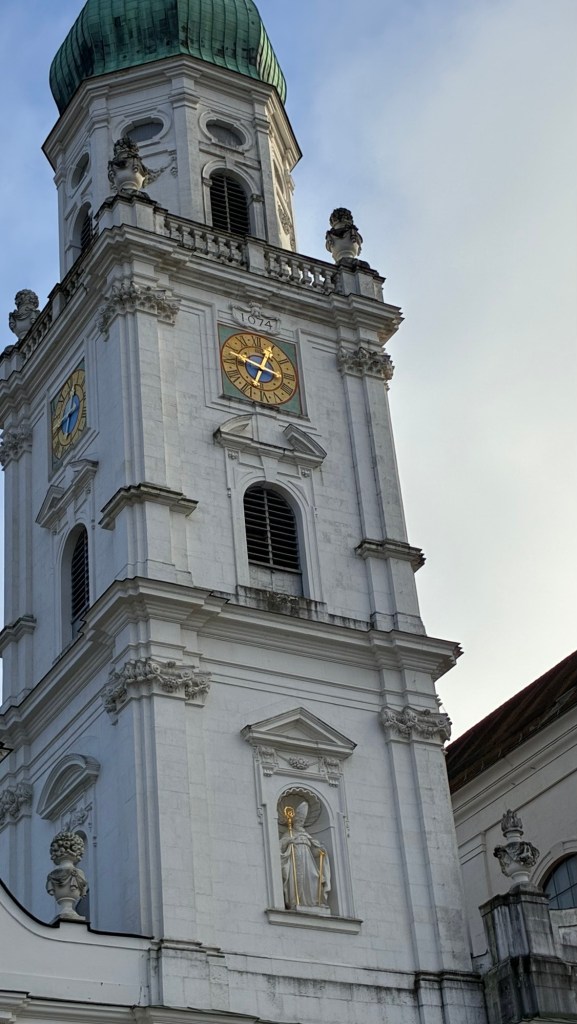 Way to start a breakfast. A selection of juices plus Mimosas!Our hotel located directly across the street of St Stephan’s Cathedral.No hotel parking – it’s three blocks away and all cobblestones.Regensberg church.St Paul’s church – Regensberg.Streets and alleys of Passau, Germany.Left section of the exterior of St Stephan’s CathedralA Baroque masterpiece with a large number of frescoes.Passat Christmas Market.A MalibuPunch and a chimney cake – inside is lined with Nutella and then rolled in walnuts! YUMMY!Some pictures of the interior of St Stephan Cathedral.Massive updating throughout the church.Sidewalk cafe in Passau. It’s almost zero so no one is there.Side entrance to St Paul’s church which is older than the cathedral.One of the world’s largest organs.Our gloomy drive from Passau Germany to the town of Cesky Krumlov, Czech Republic. Not on the autobahn so it took us hours to get here.Our residence for the night, Krumlov Tower. We’re on the ground level, only three rooms in this tower.Cesky Krumlov Christmas Markets.Hamburger and fries for dinner.Brown pigeon in Passau Germany