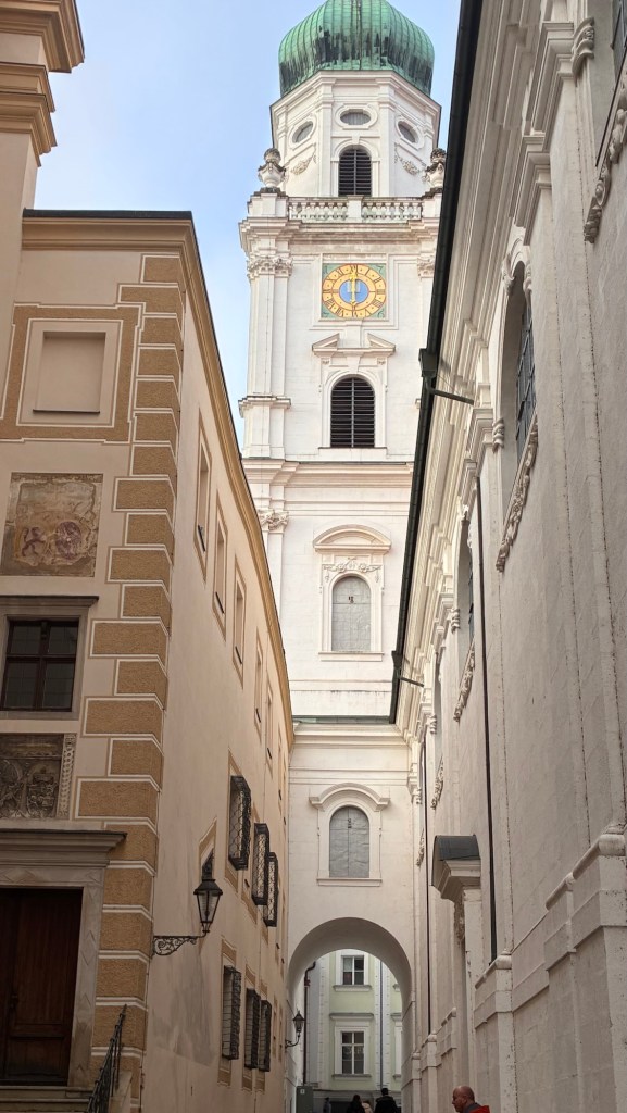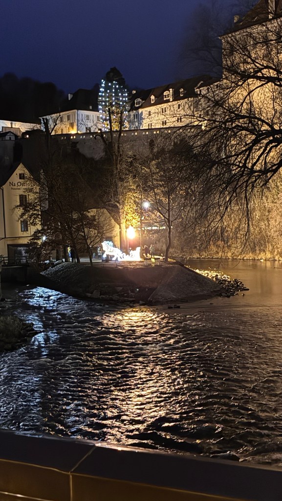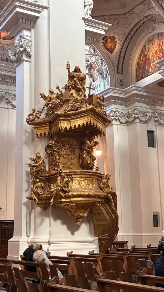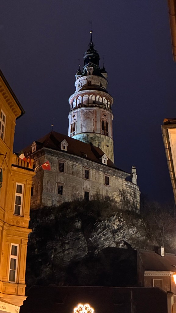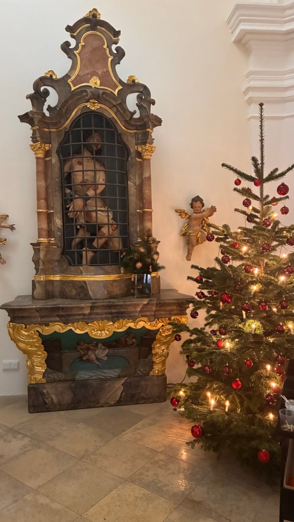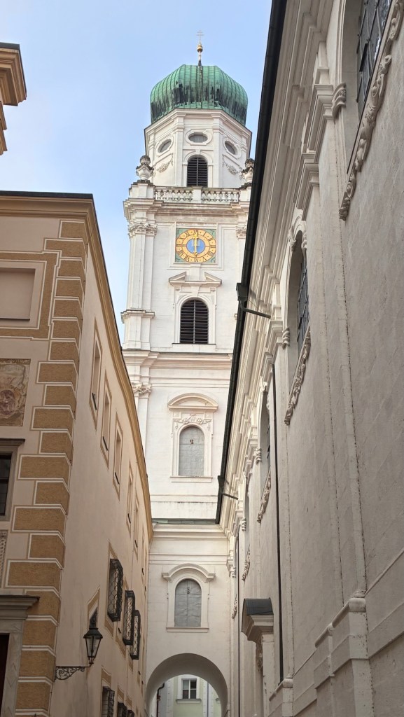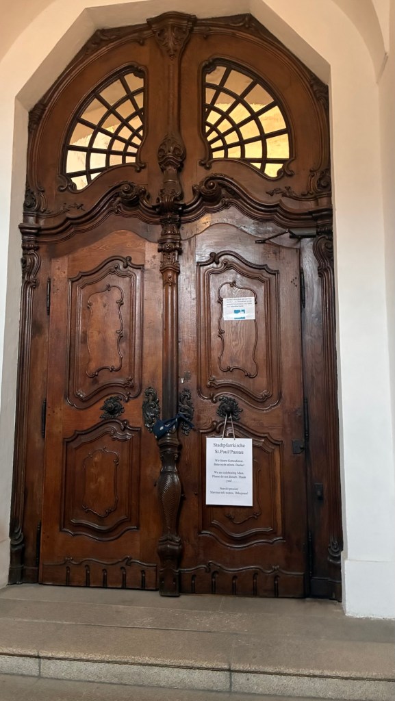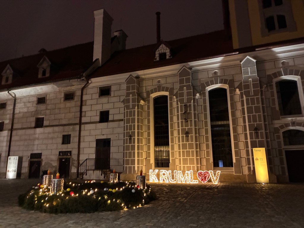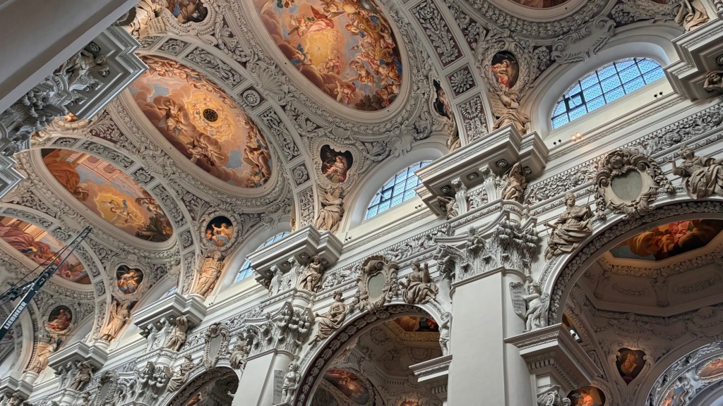 Way to start a breakfast. A selection of juices plus Mimosas!Our hotel located directly across the street of St Stephan’s Cathedral.No hotel parking – it’s three blocks away and all cobblestones.Regensberg church.St Paul’s church – Regensberg.Streets and alleys of Passau, Germany.Left section of the exterior of St Stephan’s CathedralA Baroque masterpiece with a large number of frescoes.Passat Christmas Market.A MalibuPunch and a chimney cake – inside is lined with Nutella and then rolled in walnuts! YUMMY!Some pictures of the interior of St Stephan Cathedral.Massive updating throughout the church.Sidewalk cafe in Passau. It’s almost zero so no one is there.Side entrance to St Paul’s church which is older than the cathedral.One of the world’s largest organs.Our gloomy drive from Passau Germany to the town of Cesky Krumlov, Czech Republic. Not on the autobahn so it took us hours to get here.Our residence for the night, Krumlov Tower. We’re on the ground level, only three rooms in this tower.Cesky Krumlov Christmas Markets.Hamburger and fries for dinner.Brown pigeon in Passau Germany