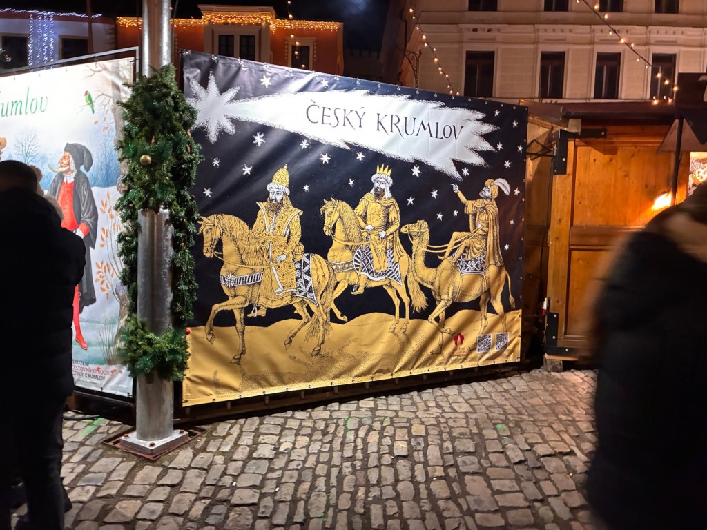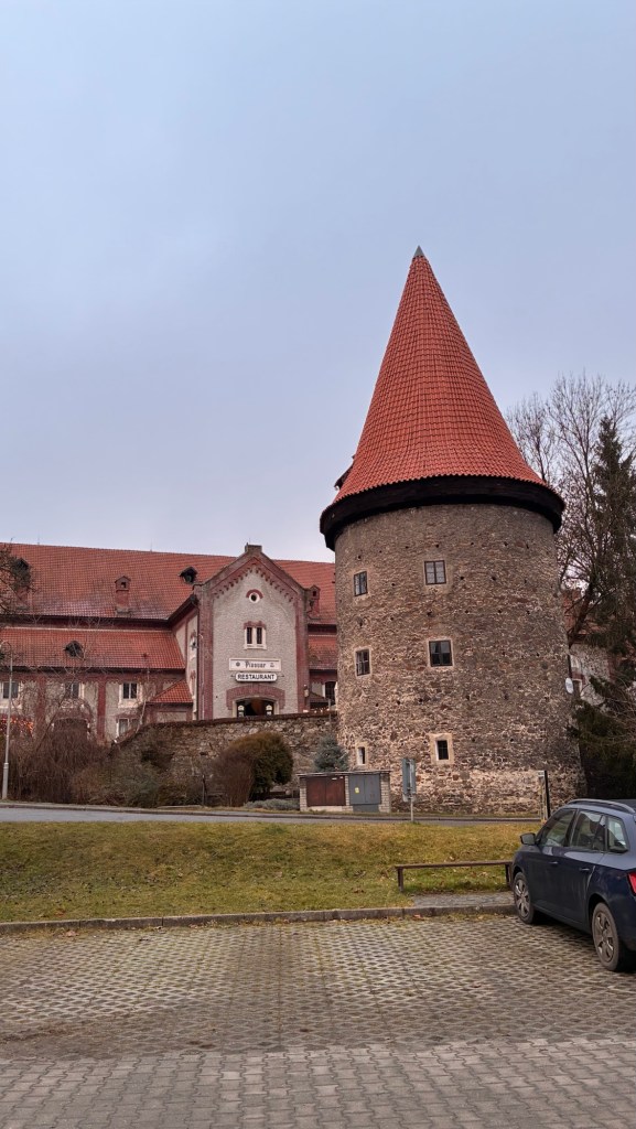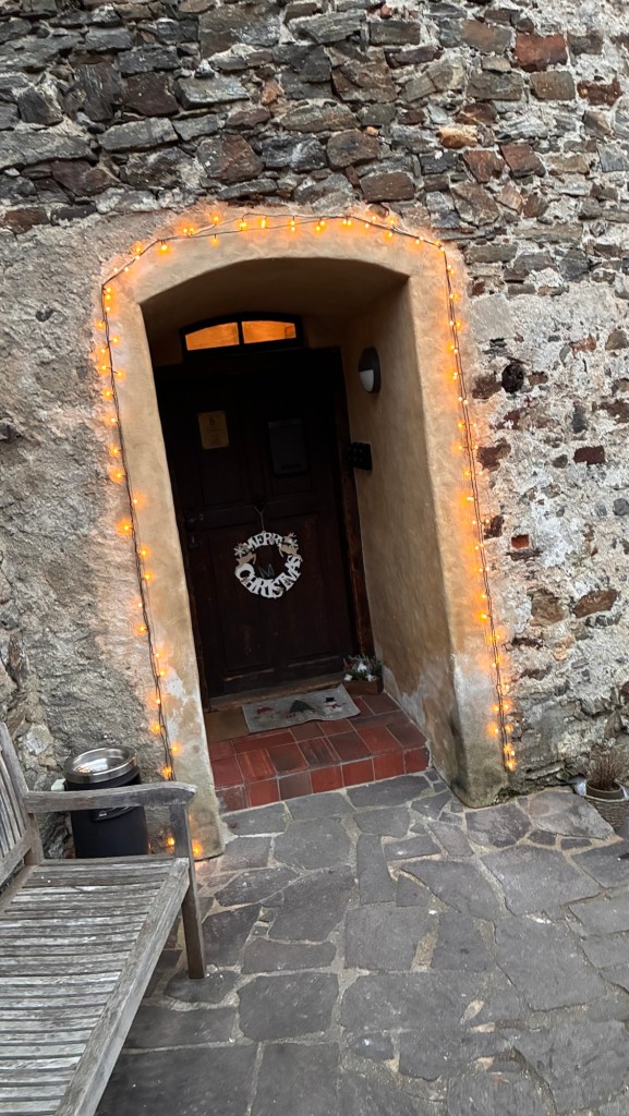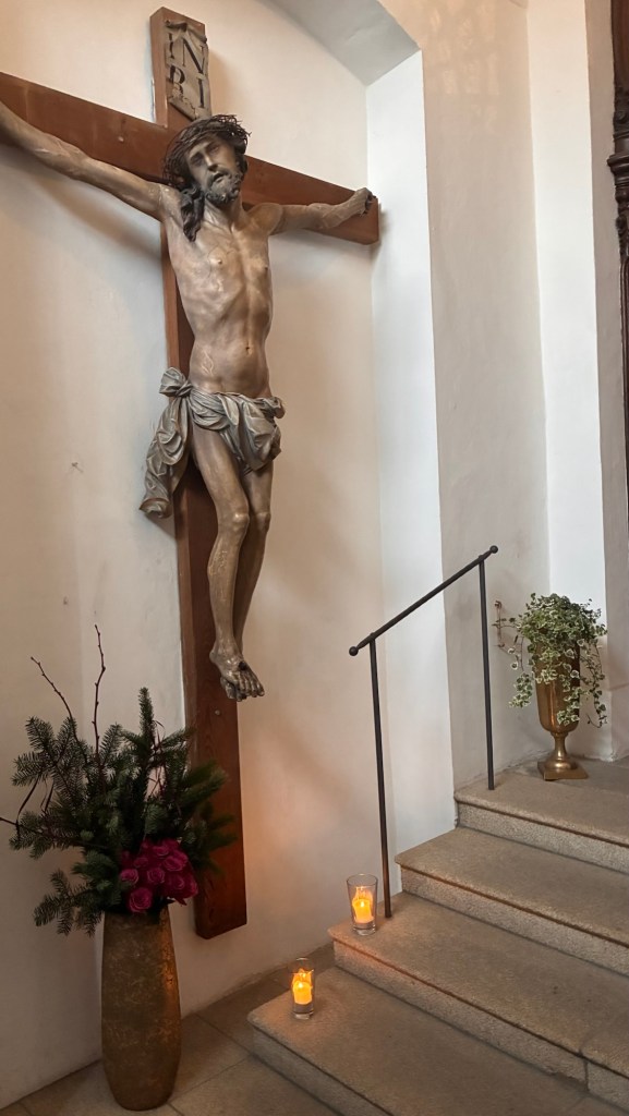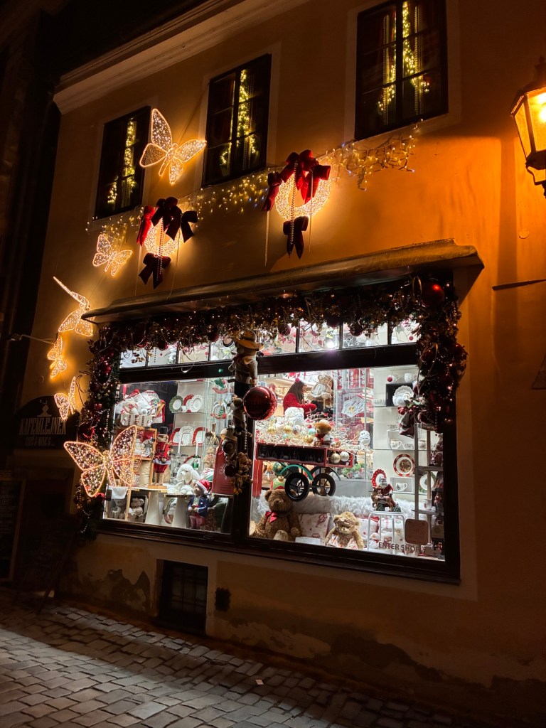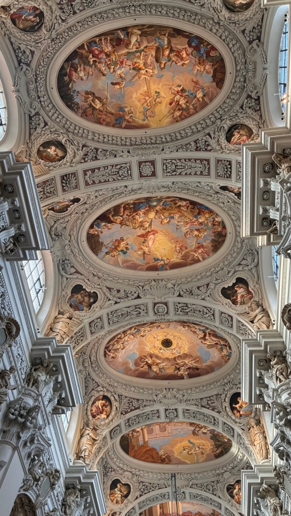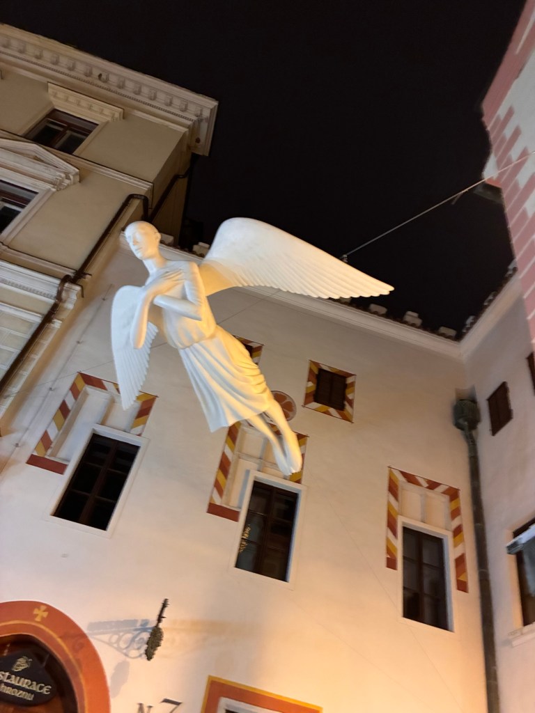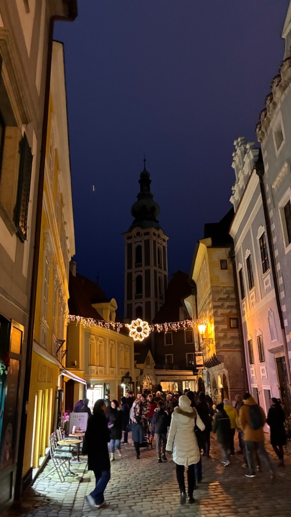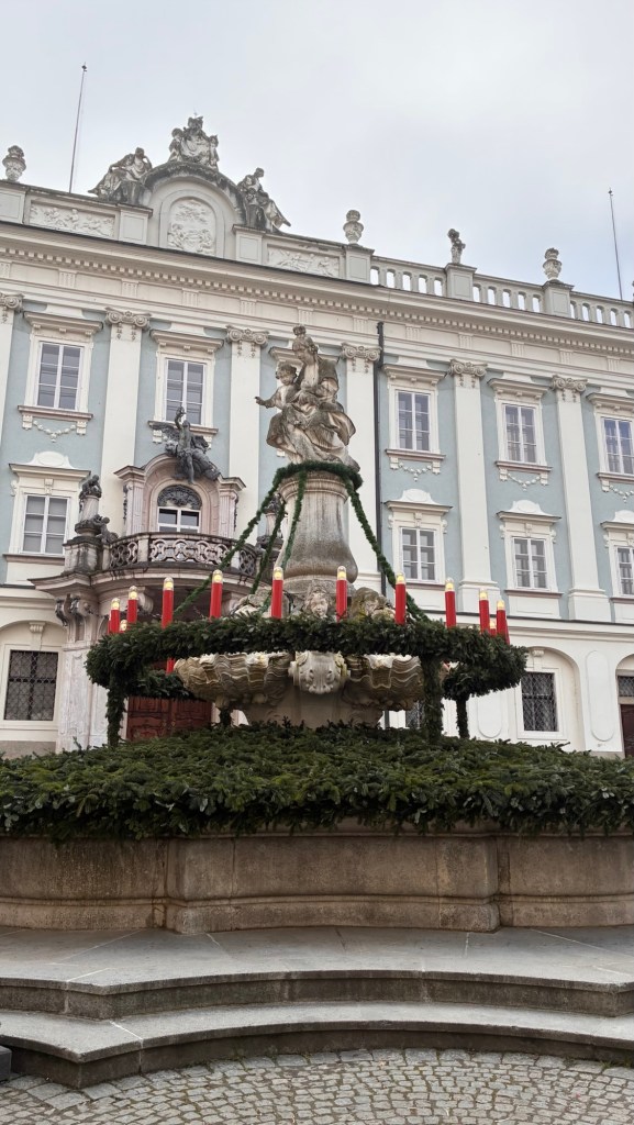 Way to start a breakfast. A selection of juices plus Mimosas!Our hotel located directly across the street of St Stephan’s Cathedral.No hotel parking – it’s three blocks away and all cobblestones.Regensberg church.St Paul’s church – Regensberg.Streets and alleys of Passau, Germany.Left section of the exterior of St Stephan’s CathedralA Baroque masterpiece with a large number of frescoes.Passat Christmas Market.A MalibuPunch and a chimney cake – inside is lined with Nutella and then rolled in walnuts! YUMMY!Some pictures of the interior of St Stephan Cathedral.Massive updating throughout the church.Sidewalk cafe in Passau. It’s almost zero so no one is there.Side entrance to St Paul’s church which is older than the cathedral.One of the world’s largest organs.Our gloomy drive from Passau Germany to the town of Cesky Krumlov, Czech Republic. Not on the autobahn so it took us hours to get here.Our residence for the night, Krumlov Tower. We’re on the ground level, only three rooms in this tower.Cesky Krumlov Christmas Markets.Hamburger and fries for dinner.Brown pigeon in Passau Germany