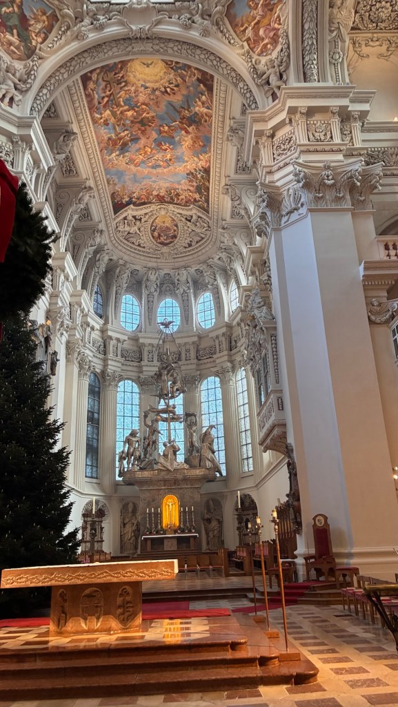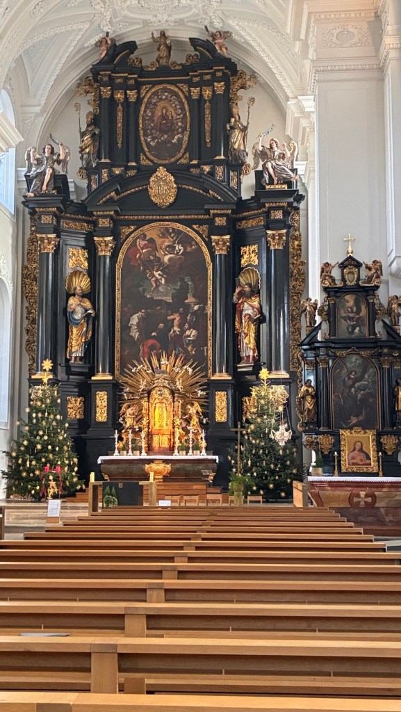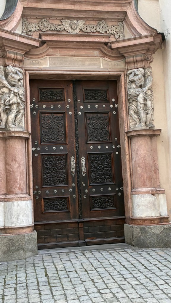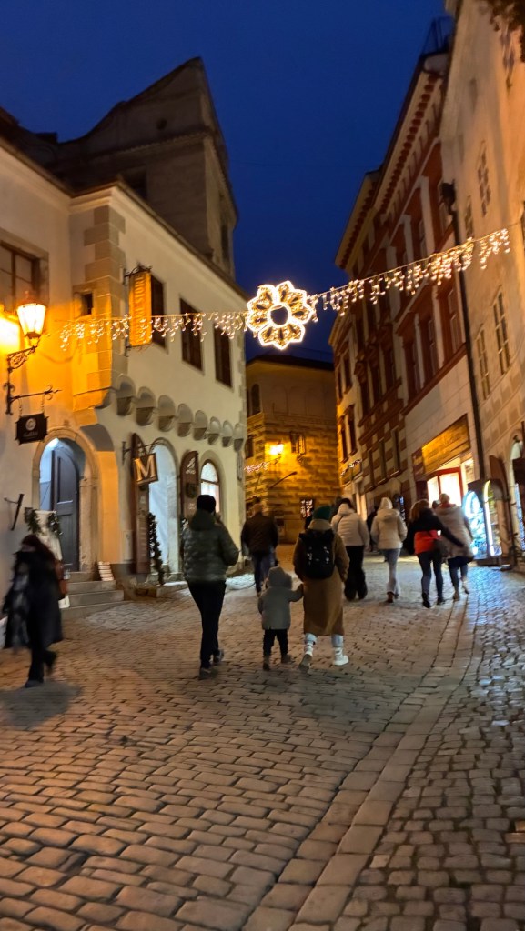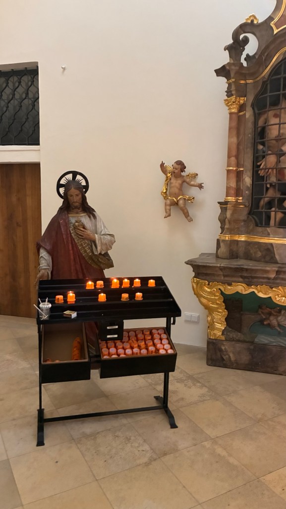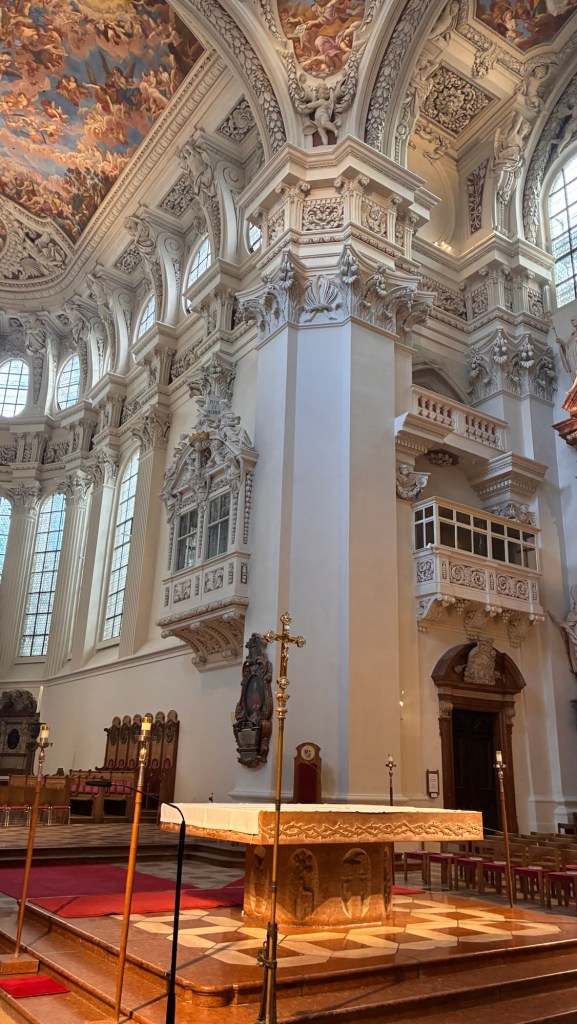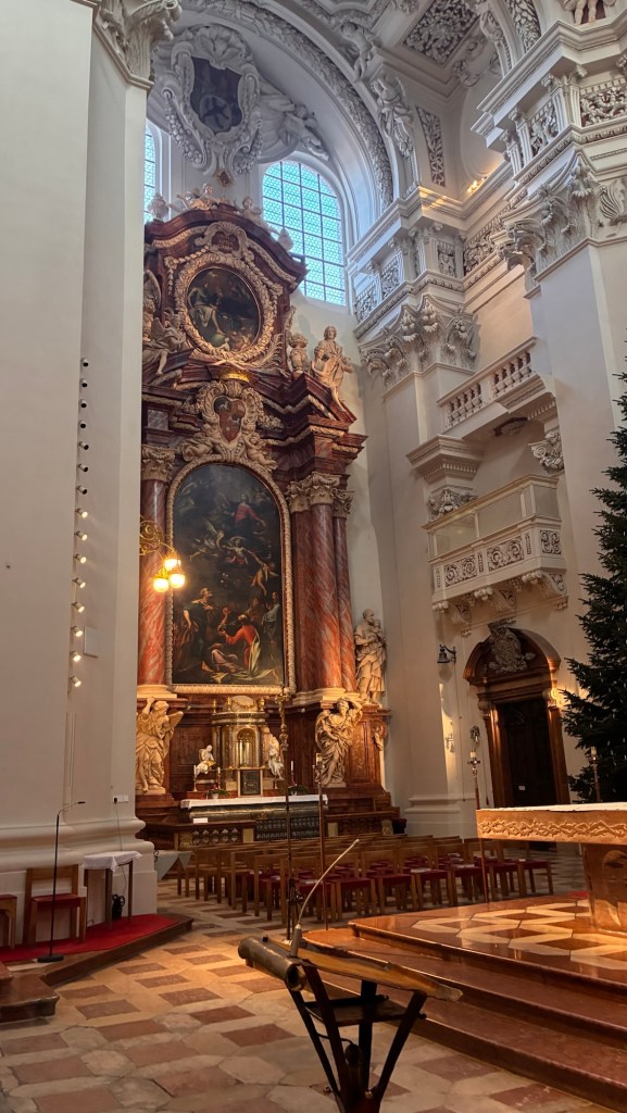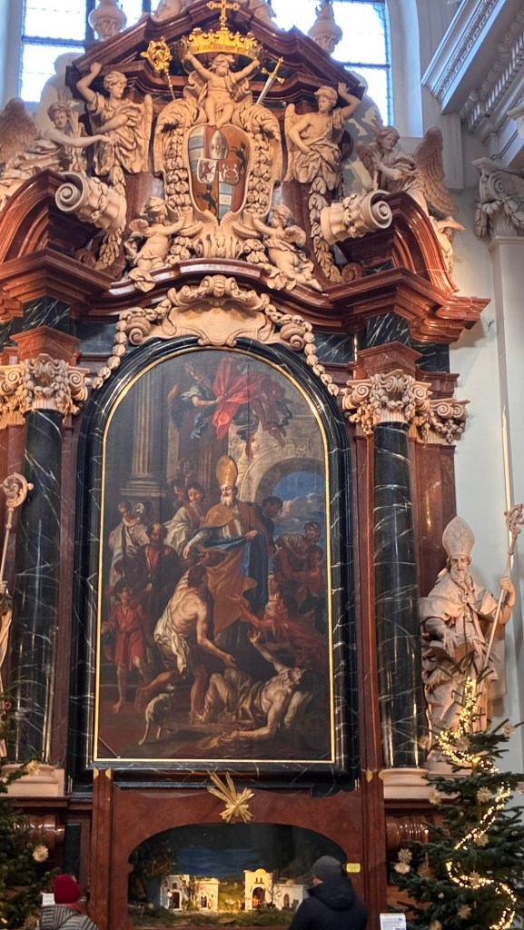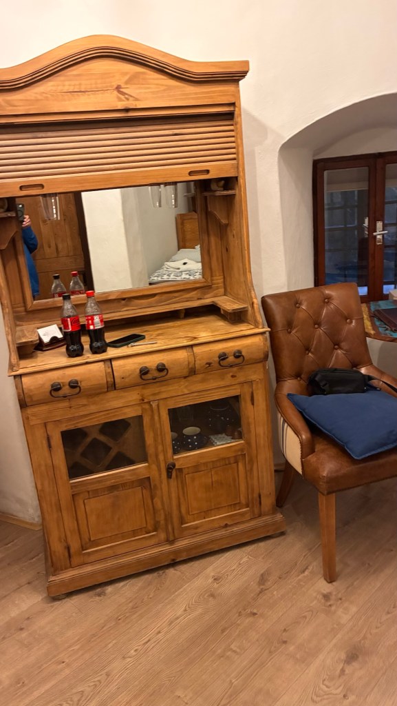 Way to start a breakfast. A selection of juices plus Mimosas!Our hotel located directly across the street of St Stephan’s Cathedral.No hotel parking – it’s three blocks away and all cobblestones.Regensberg church.St Paul’s church – Regensberg.Streets and alleys of Passau, Germany.Left section of the exterior of St Stephan’s CathedralA Baroque masterpiece with a large number of frescoes.Passat Christmas Market.A MalibuPunch and a chimney cake – inside is lined with Nutella and then rolled in walnuts! YUMMY!Some pictures of the interior of St Stephan Cathedral.Massive updating throughout the church.Sidewalk cafe in Passau. It’s almost zero so no one is there.Side entrance to St Paul’s church which is older than the cathedral.One of the world’s largest organs.Our gloomy drive from Passau Germany to the town of Cesky Krumlov, Czech Republic. Not on the autobahn so it took us hours to get here.Our residence for the night, Krumlov Tower. We’re on the ground level, only three rooms in this tower.Cesky Krumlov Christmas Markets.Hamburger and fries for dinner.Brown pigeon in Passau Germany