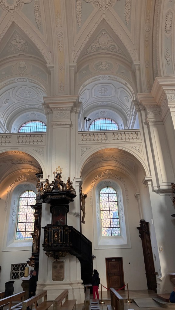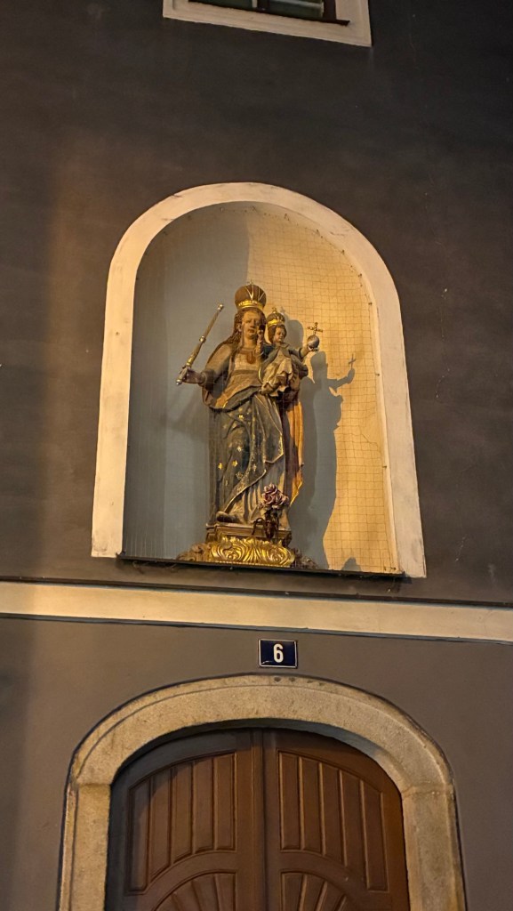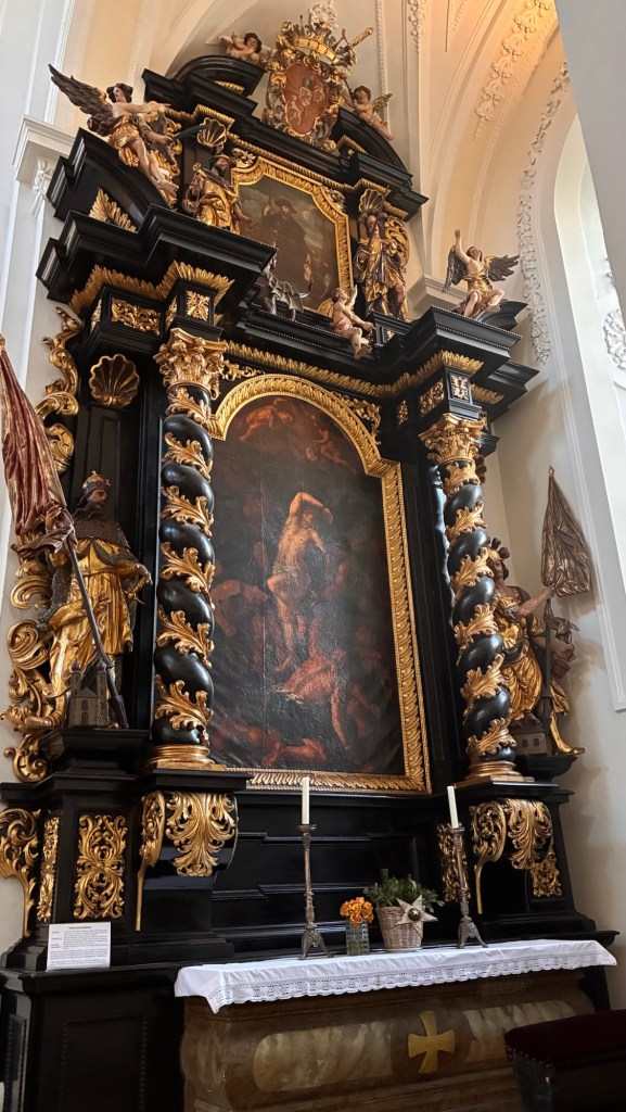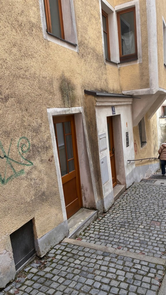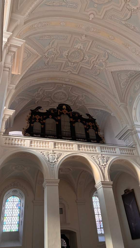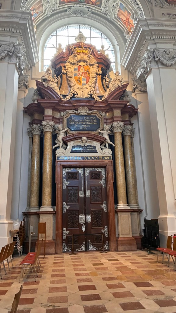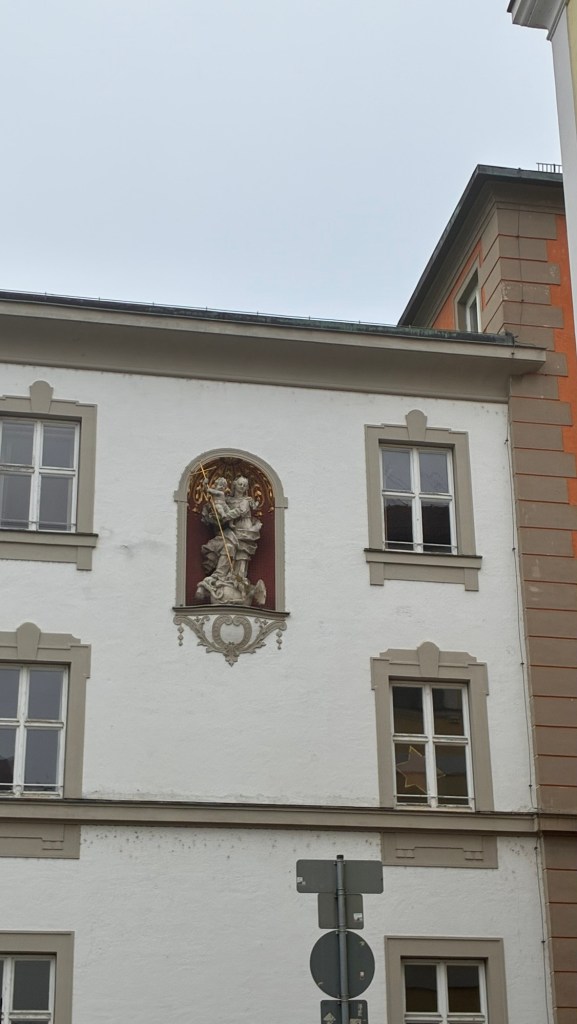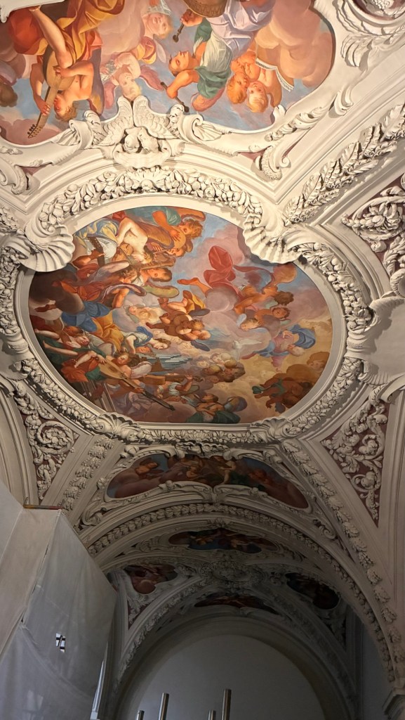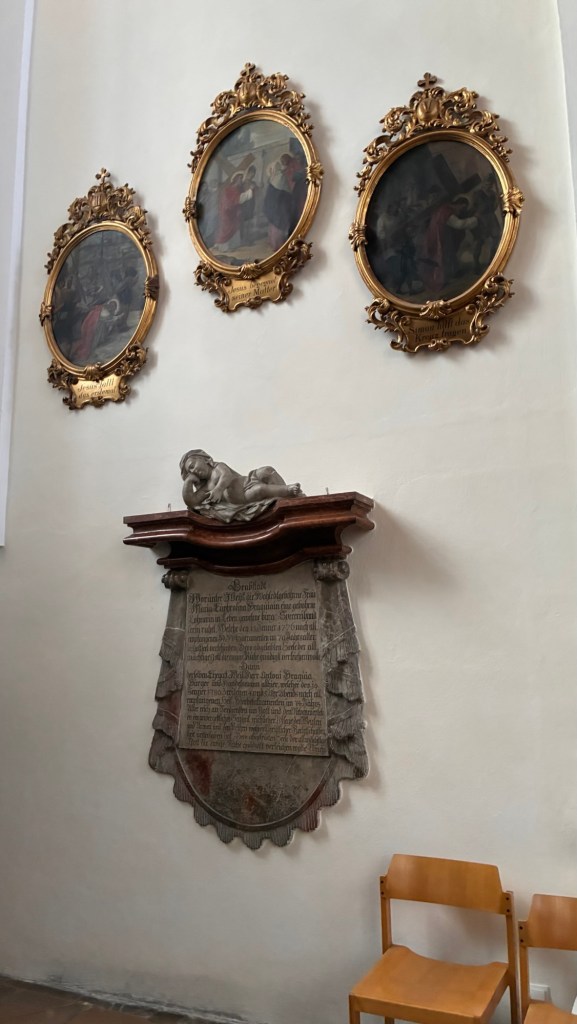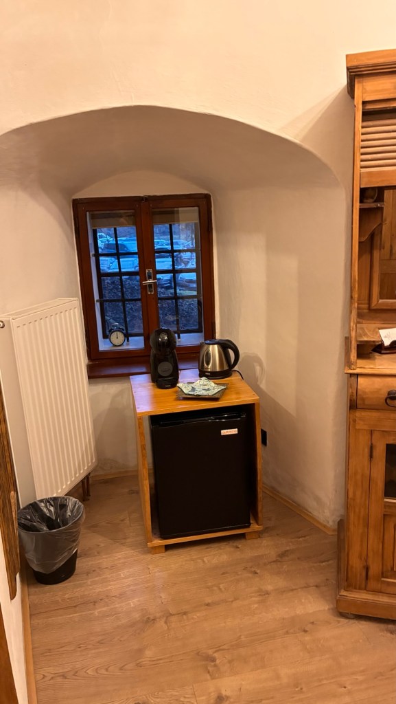Way to start a breakfast. A selection of juices plus Mimosas!Our hotel located directly across the street of St Stephan’s Cathedral.No hotel parking – it’s three blocks away and all cobblestones.Regensberg church.St Paul’s church – Regensberg.Streets and alleys of Passau, Germany.Left section of the exterior of St Stephan’s CathedralA Baroque masterpiece with a large number of frescoes.Passat Christmas Market.A MalibuPunch and a chimney cake – inside is lined with Nutella and then rolled in walnuts! YUMMY!Some pictures of the interior of St Stephan Cathedral.Massive updating throughout the church.Sidewalk cafe in Passau. It’s almost zero so no one is there.Side entrance to St Paul’s church which is older than the cathedral.One of the world’s largest organs.Our gloomy drive from Passau Germany to the town of Cesky Krumlov, Czech Republic. Not on the autobahn so it took us hours to get here.Our residence for the night, Krumlov Tower. We’re on the ground level, only three rooms in this tower.Cesky Krumlov Christmas Markets.Hamburger and fries for dinner.Brown pigeon in Passau Germany