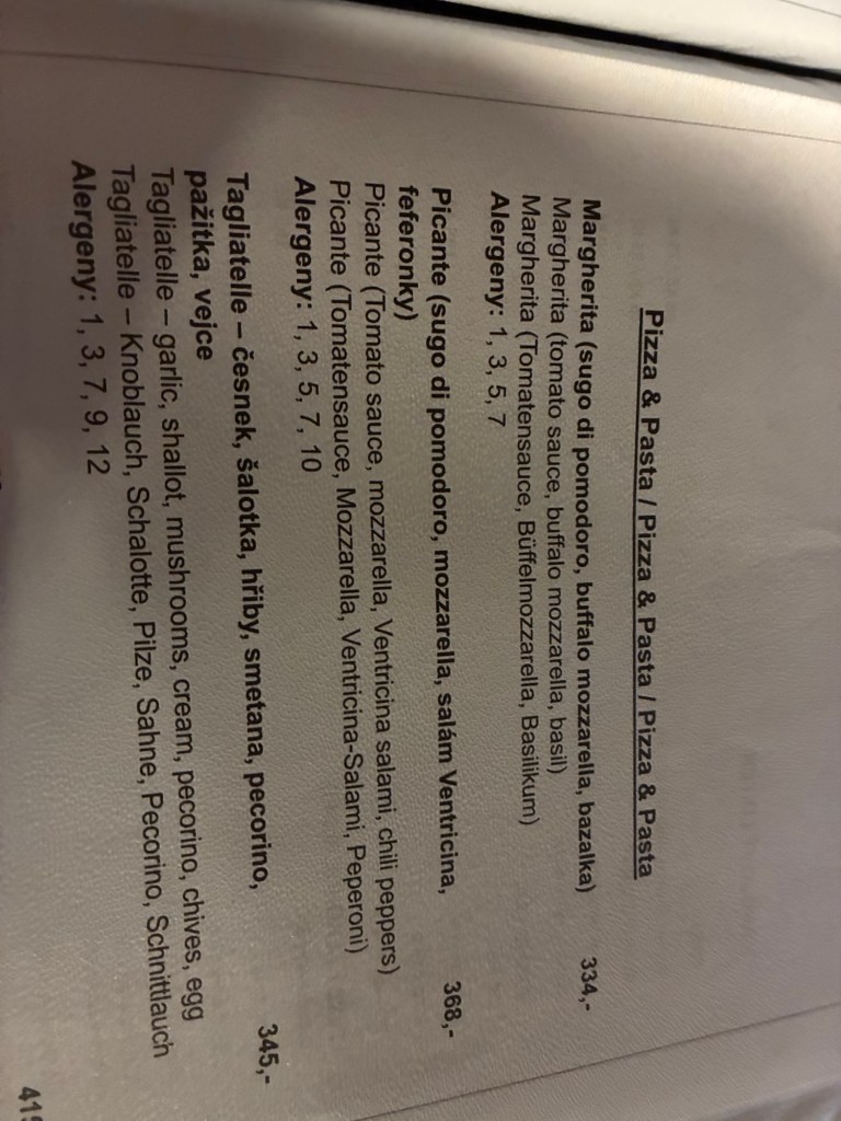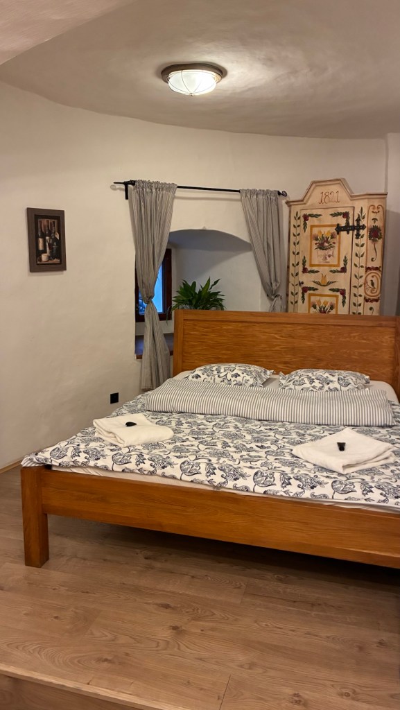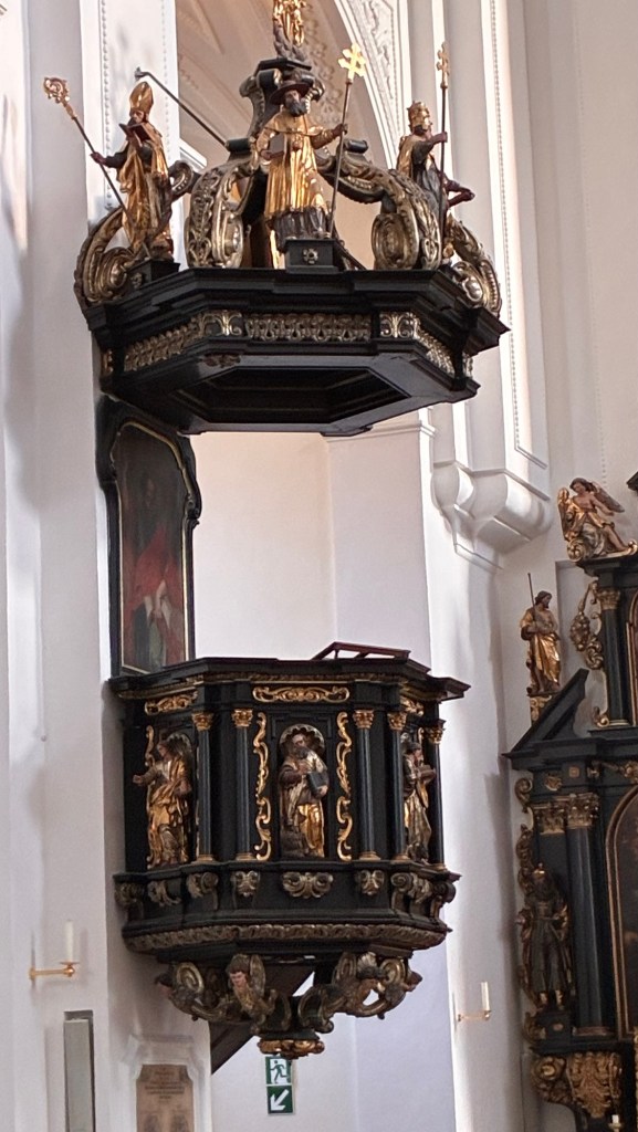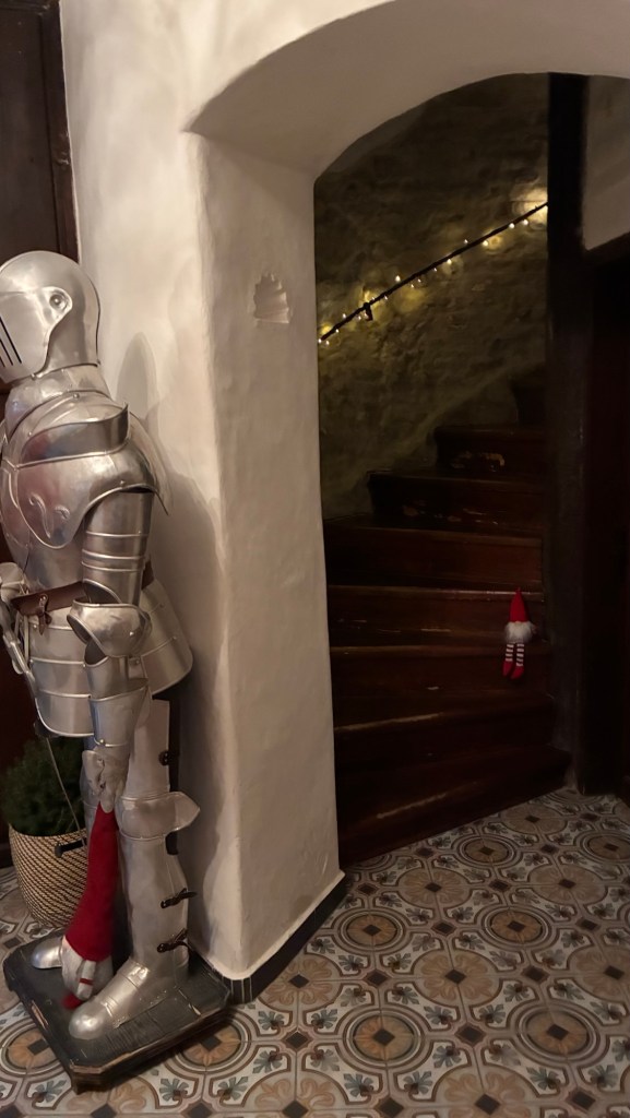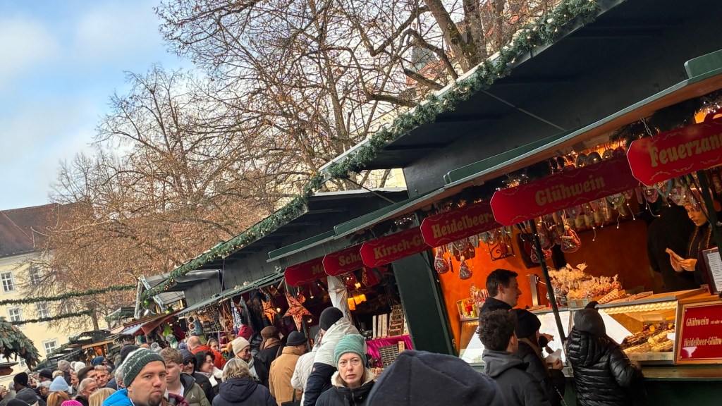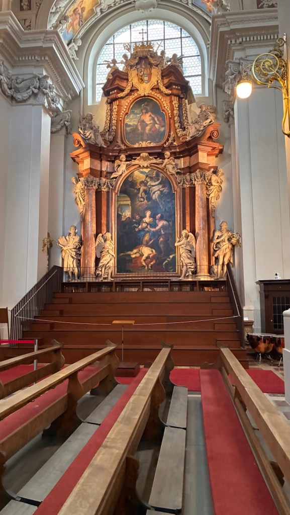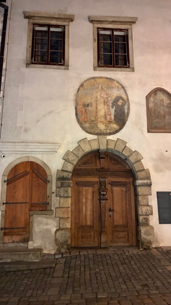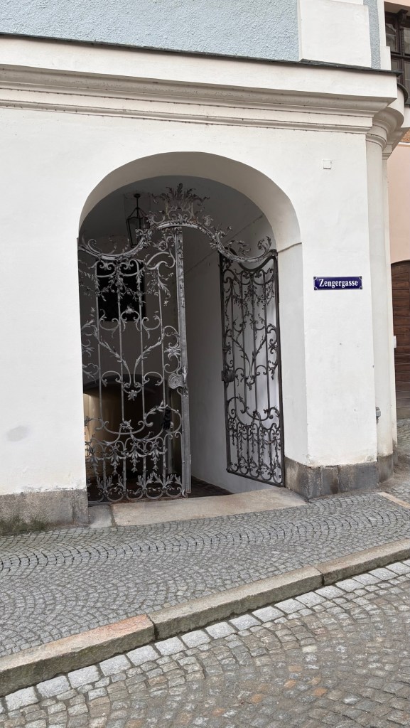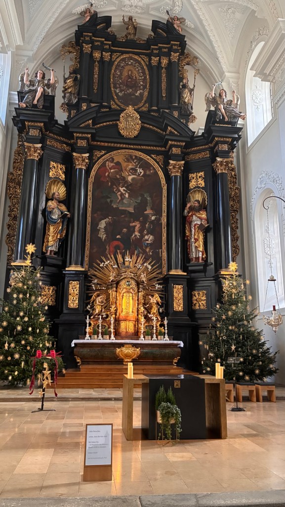 Way to start a breakfast. A selection of juices plus Mimosas!Our hotel located directly across the street of St Stephan’s Cathedral.No hotel parking – it’s three blocks away and all cobblestones.Regensberg church.St Paul’s church – Regensberg.Streets and alleys of Passau, Germany.Left section of the exterior of St Stephan’s CathedralA Baroque masterpiece with a large number of frescoes.Passat Christmas Market.A MalibuPunch and a chimney cake – inside is lined with Nutella and then rolled in walnuts! YUMMY!Some pictures of the interior of St Stephan Cathedral.Massive updating throughout the church.Sidewalk cafe in Passau. It’s almost zero so no one is there.Side entrance to St Paul’s church which is older than the cathedral.One of the world’s largest organs.Our gloomy drive from Passau Germany to the town of Cesky Krumlov, Czech Republic. Not on the autobahn so it took us hours to get here.Our residence for the night, Krumlov Tower. We’re on the ground level, only three rooms in this tower.Cesky Krumlov Christmas Markets.Hamburger and fries for dinner.Brown pigeon in Passau Germany