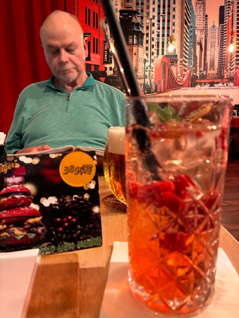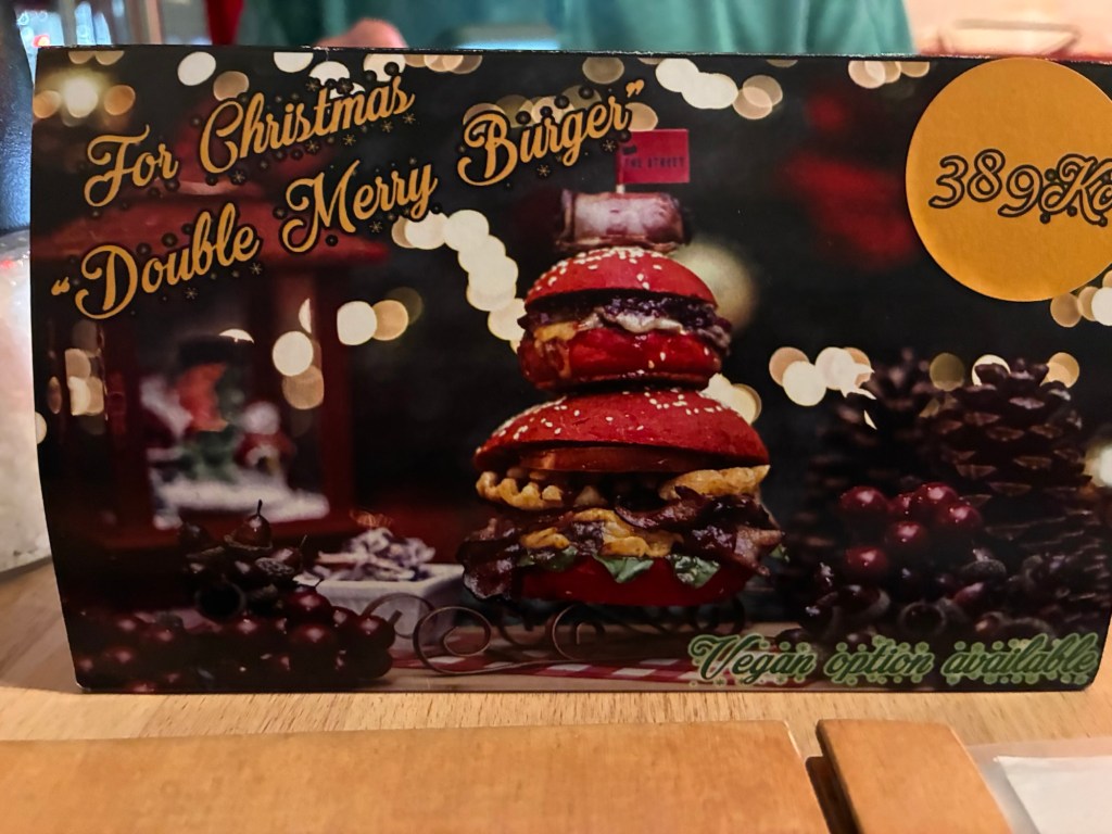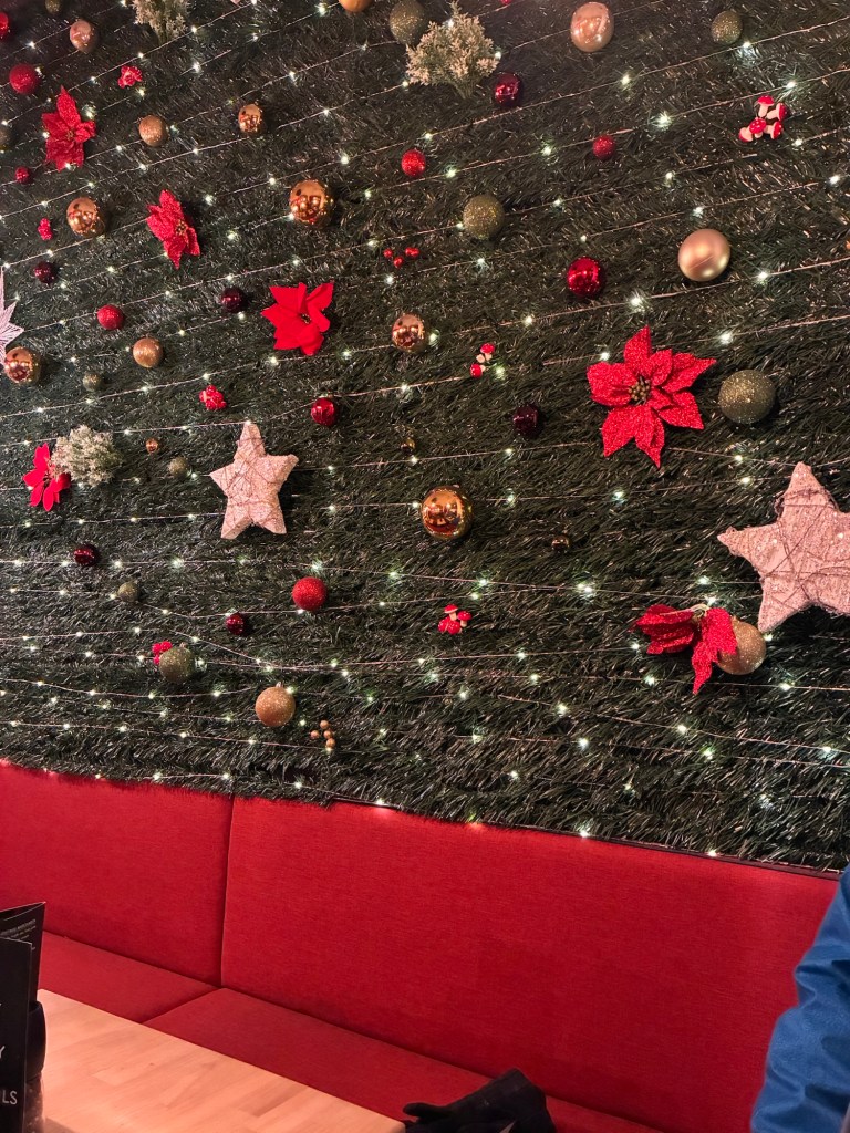 Restaurant wall decorated for the holidays,
